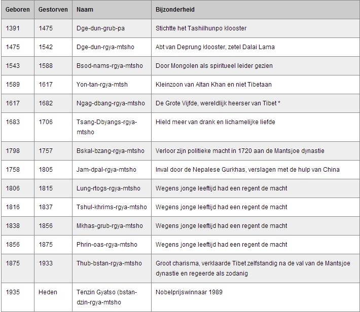 De eerste Dalai Lama (Gendün Drub) werd in 1391 geboren en betrad als eerste het Tashilhunpo klooster in Shigatse, Tibet. Hij was een neef ‘Tsongkhapa’, de stichter van de ‘gelugschool’ in 1409. De gelug orde wordt vaak beschreven als een sekte genaamd 'Yellow hats' (door de gele hoofddeksels). De vijfde Dalai Lama werd naast zijn functie als hoofd van het klooster ook de politiek leider van Tibet. Dit bleef zo tot aan de 13e Dalai Lama. De 14e en tevens huidige leider heeft het Potala Paleis in Tibet (China) moeten ontvluchten toen de Chinezen in 1950 het bestuur van Tibet overnamen. Tenzin Gyatso is de huidige, veertiende dalai lama. Een overzicht van alle geestelijk leiders: