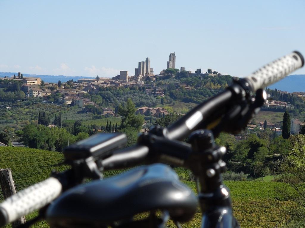 De weg naar San Gimignano is daarnaast uiteraard adembenemend (letterlijk en figuurlijk, de weg gaat grotendeels omhoog …..…). Je rijdt richting Pancole en komt langs een prachtig oud kerkje en niet ver daarna langs een schitterende villa. Nog weer verderop kom je bij het Santuario di Maria Santissima Madre della Divina Provvidenza (het heiligdom van de allerheiligste moeder van de goddelijke voorzienigheid). Een hele mond vol! Het is een klooster waar je langs en onderdoor fiets. Het klooster is rond 1600 gebouwd rondom een fresco van de Madonna uit de periode 1475-1499. Het verhaal gaat dat het fresco door omstandigheden door bramen was overgroeid maar werd herontdekt door een vrouwelijke herder. Deze herderin kon niet praten en zat op een dag heel verdrietig exact bij deze grote hoop bramen, waarna zij toen in gesprek kwam met de madonna. De herderin legde uit waarom ze zo verdrietig was (het was een periode van grote armoede en droogte) en de madonna beloofde dat ze thuis een kelder vol wijn, een kast vol brood en een container vol olijfolie zou vinden. De herderin rende naar huis al vol blijdschap over het feit dat ze ineens bleek te kunnen praten en vond thuis inderdaad te eten en te drinken. Het verhaal deed snel de ronde en de boeren vonden daarna in de bramen het fresco van de madonna. Met zo’n schitterend wonder werd er uiteraard later een Santuario omheen gebouwd.