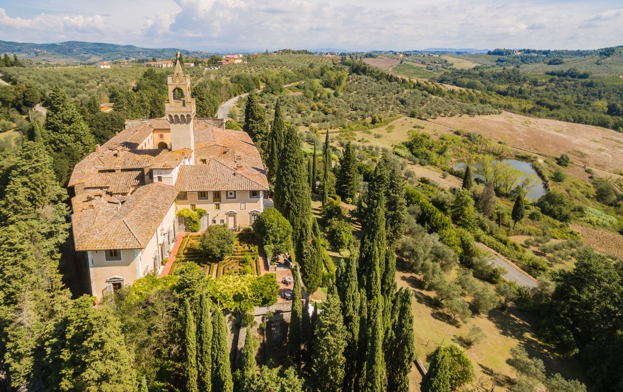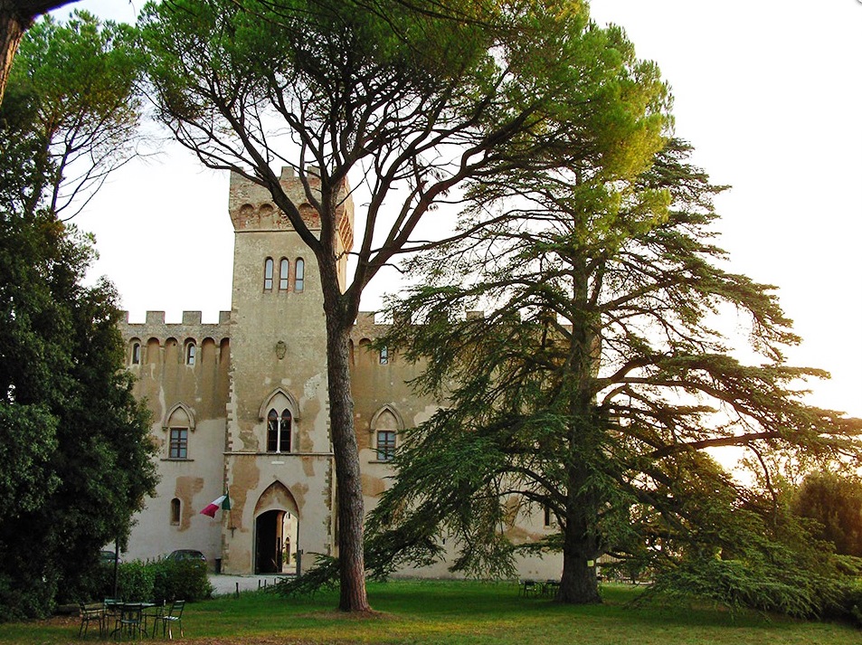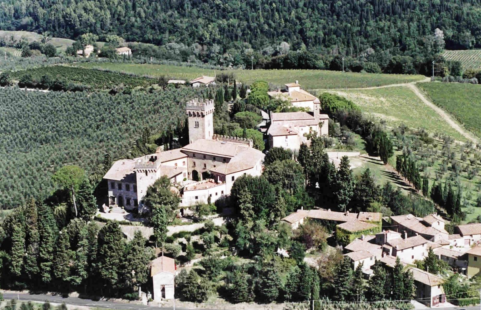 Verderop zie je rechts het kasteel van Poppiano liggen, een prachtig en groot kasteel dat sinds het is gebouwd (waarschijnlijk rond het jaar duizend) altijd in handen is gebleven van dezelfde familie, heel bijzonder uiteraard. Het kasteel wordt voor het eerst genoemd in een document uit 1199 en was toen al in het bezit van de familie Guicciardini, een nobele familie uit Florence. Deze familie bezit een groot aantal villa’s in dezelfde buurt en als je goed oplet zul je het schild (twee jachthoorns) op vele gebouwen terugvinden tijdens het fietsen.