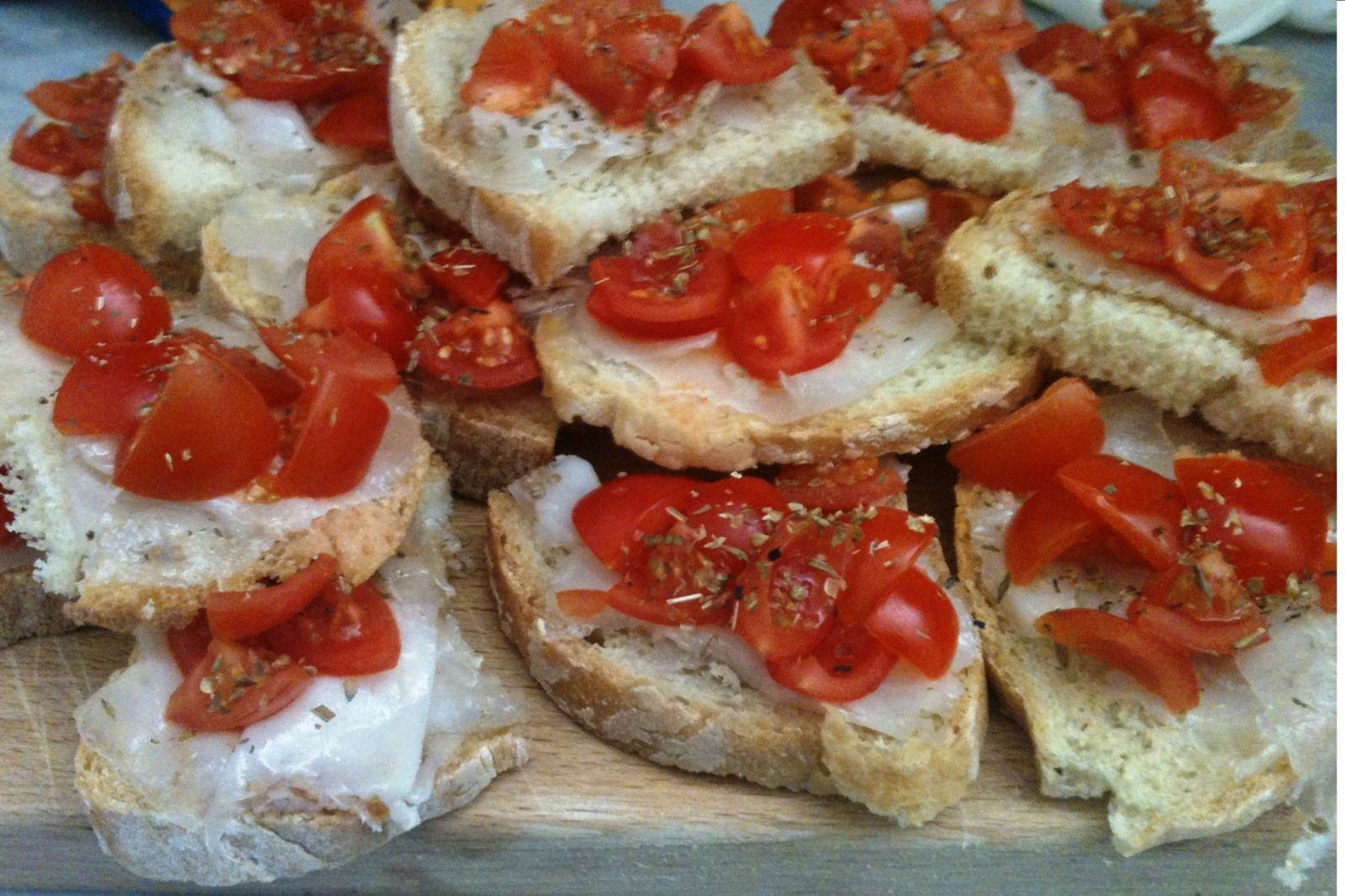 Snijd het brood in stukken van 1 cm dik. Rooster deze in de oven op 200 graden totdat ze bruin worden. Laat afkoelen. Snijd vervolgens de lardo in plakjes of reepjes. Was de tomaatjes en snijd ze in vieren. Hak de rozemarijn fijn. Leg de lardo op het brood, strooi er wat peper over en leg er vervolgens een tomatenpartje en wat rozemarijn op. Serveer direct. Eventueel kan het brood vooraf nog met knoflook worden bestreken.