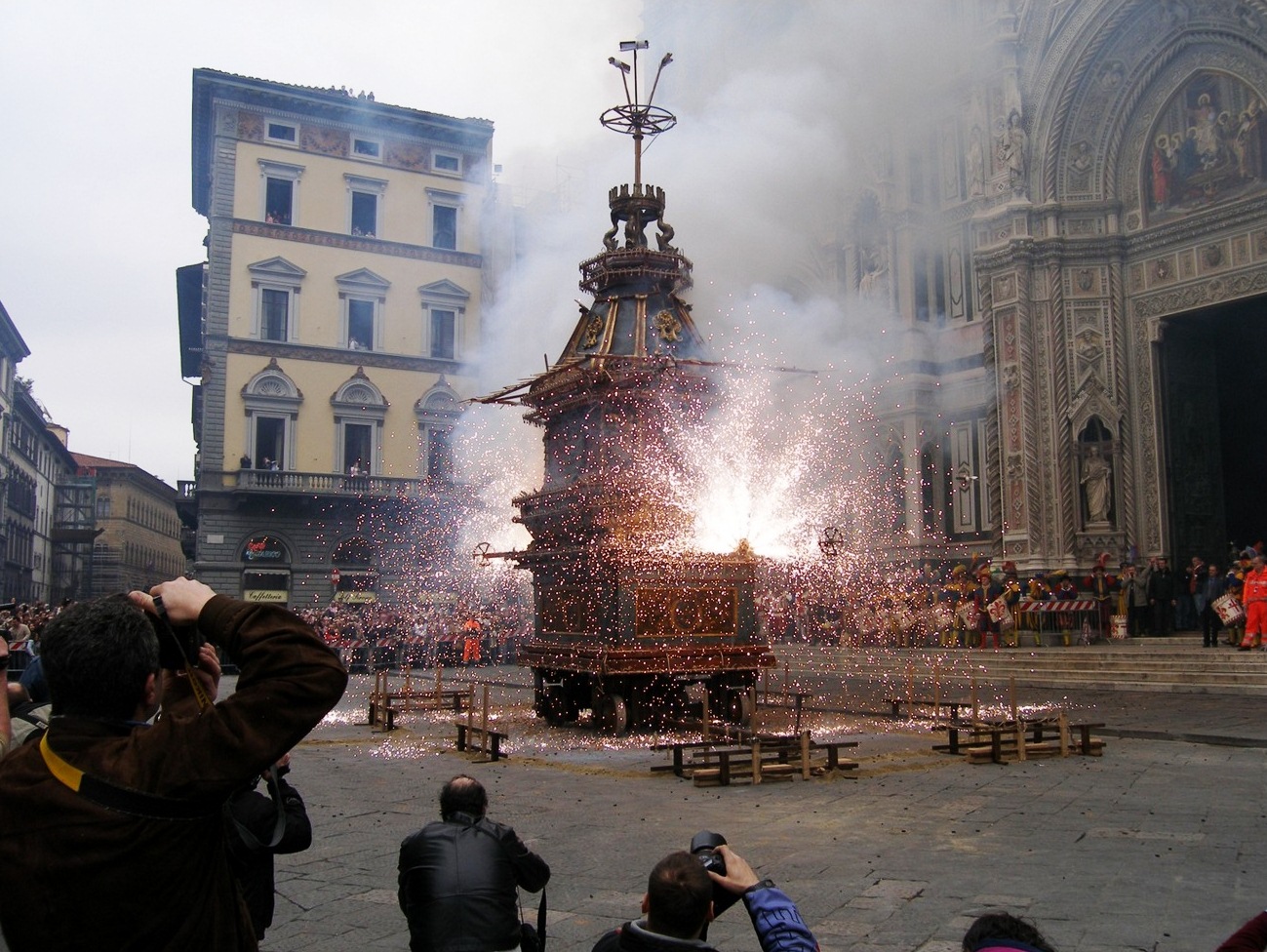 Het belangrijkste paasevenement in Florence is zonder twijfel Lo scoppio del carro, (de explosie van de kar). Na de dienst in de Dom arriveert een versierde wagen op het dom plein. Exact om twaalf uur steekt de bisschop deze in brand met behulp van een duif, waarna een kleurrijk vuur ontstaat. Heeft de duif moeite om het vuur te ontsteken, dan voorspelt dat een slechte oogst. Lees hier meer over de traditie van Lo Scoppio del carro.
