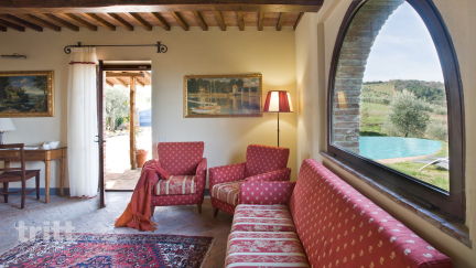 Deze villa is één van de twee vrijstaande villa’s die verspreid liggen op het terrein van het landgoed in Gambassi. Dit typisch Toscaanse landgoed van 62 ha., is gelegen in de heuvels van de Florentijnse Chiantistreek, dichtbij beroemde kunststeden als Florence, Siena, San Gimignano en Volterra.