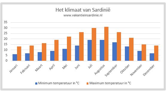 De beste maanden om naar Sardinië te gaan zijn mei, juni, juli en september. Je geniet dan van een gemiddelde temperatuur van 26 graden. Augustus is de warmste maand op het eiland. Hou er ook rekening mee dat het in deze maand drukker kan zijn: dan hebben ook de Italianen vakantie. Sardinië is ook voor hen een zeer populaire vakantiebestemming.