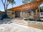 Deze bungalow behoort tot de meest royale accommodaties van de camping en biedt met circa 70 m² volop leefruimte voor 6 personen, met de mogelijkheid om een extra bed te plaatsen voor een 7e persoon. De lichte open woonruimte bestaat uit een volledig ingerichte kitchenette met magnetron, een eettafel met stoelen, een comfortabele zithoek en tv. Er is 1 slaapkamer met tweepersoonsbed en 2 slaapkamers met elk 2 eenpersoonsbedden. Daarnaast zijn er 2 badkamers met douche en bidet. Buiten vormt de grote, overdekte patio met tafel en stoelen een fijne plek om samen te eten of te ontspannen, met uitzicht op de pineta en de omliggende accommodaties. Airconditioning en verwarming zorgen het hele seizoen door voor een aangenaam verblijf.