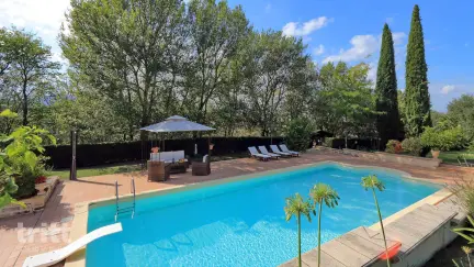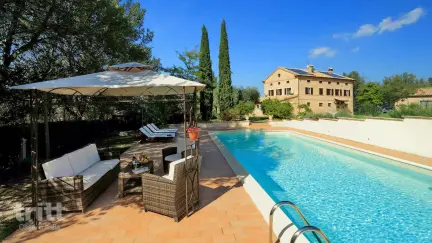 De villa bestaat uit een ruime hoofdwoning en een recent gebouwde, moderne dependance. In totaal zijn er 4 slaapkamers, allemaal voorzien van airconditioning, wat het verblijf ook tijdens warme zomerdagen aangenaam maakt. In de hoofdwoning vind je op de begane grond een lichte woonkamer met zit- en eethoek, een volledig ingerichte woonkeuken en een badkamer. Daarnaast is er een aparte wasruimte met wasmachine en strijkfaciliteiten. Op de eerste verdieping bevinden zich 3 tweepersoonsslaapkamers en 2 badkamers. Eén slaapkamer beschikt over een ensuite badkamer en een royaal balkon met weids uitzicht over het landschap. De dependance biedt extra privacy en is ideaal voor bijvoorbeeld een stel of oudere kinderen. Hier is een slaapkamer met tweepersoonsbed, een klein woongedeelte met slaapbank en kitchenette en een eigen badkamer met douche. Ook deze ruimte is volledig voorzien van airconditioning. Rondom de villa ligt een volledig omheinde tuin van circa 1 hectare. Direct aan de woning bevindt zich een overdekt terras waar je in alle rust kunt eten. Op een lager gelegen deel van de tuin ligt het privé zwembad met zonneterras, dat op aanvraag verwarmd kan worden.