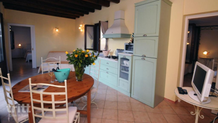 Het driekamerappartement op de eerste verdieping biedt een woonkamer met eethoek en tweepersoonsslaapbank, een keuken en twee tot drie slaapkamers, afhankelijk van de indeling, voor maximaal 6 personen. De badkamer heeft een douche en toilet, en buiten vind je een overdekt privéterras of balkon. Enkele appartementen bieden de mogelijkheid voor een extra bed in de tweede slaapkamer. Alle appartementen zijn voorzien van airconditioning. Voor ontspanning zijn er een zwembad en een apart kinderbad, terwijl de kleintjes zich vermaken op het speelveldje of in de speeltuin. ’s Avonds kun je in het restaurant genieten van lokale gerechten, begeleid door de wijnen van het eigen domein. Wekelijks is er een wijnproeverij en de wijnen zijn te koop voor thuis.
