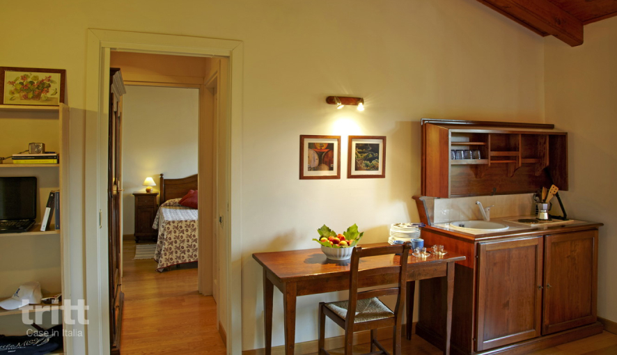 Dit appartement is geschikt voor 5 personen (2+3 personen) en ligt boven de wijnmakerij. De woonkamer beschikt over drie eenpersoonsbedden (waarvan één slaapbank met onderschuifbed) en een kitchenette met kookplaat, koelkast en koffiezetapparaat. Er is een aparte slaapkamer met tweepersoonsbed en satelliet-tv, een badkamer met douche en toilet, en buiten een balkon of terras met zitje. Ontbijt is inbegrepen. ’s Ochtends wordt een uitgebreid internationaal ontbijt geserveerd met croissants, huisgemaakte cake, fruit, yoghurt, eieren en uiteraard verse cappuccino. Op het landgoed vind je een fijn zwembad met ligbedden en parasols, omringd door wijnranken en groene heuvels. Loop je richting het zwembad, dan kom je langs de konijntjes en ezels: altijd leuk voor de kinderen!