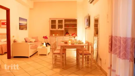 Het appartement is gelegen op de begane grond en biedt een woongedeelte met eettafel, kitchenette voorzien van servies, bestek, vaatwasser, magnetron, broodrooster en waterkoker, een televisie, een tweepersoonsslaapbank en twee slaapkamers met een tweepersoonsbed. De badkamer beschikt over een douche of bad, toilet en bidet. Buiten is een gemeubileerd terras met uitzicht op de tuin, waar je in alle rust kunt ontbijten of ontspannen. Alle appartementen zijn voorzien van airconditioning en horren. Bij het zwembad zijn voor elk appartement twee ligbedden en een parasol gereserveerd.