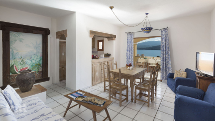 De woning ligt op de begane grond en heeft een ruime indeling met 2 slaapkamers en 2 badkamers. De mediterrane inrichting met hout, riet en zachte tinten zorgt voor een warme sfeer. In de woonkamer bevinden zich een zithoek, tv, eethoek en openslaande deuren naar het terras. De keuken is volledig uitgerust met een 4-pits kookplaat, oven, koelkast met vriesvak, vaatwasser en mokkapot. Beide slaapkamers hebben directe toegang tot een eigen badkamer met douche. Buiten ligt een groot overdekt terras met loungehoek, eettafel en een traditionele houtoven. De tuin biedt volop privacy en gedeeltelijk uitzicht op zee. De woning is voorzien van airco, wifi en een haardroger. Maximale bezetting: 6 personen en 1 baby (tot 1 jaar). Het park biedt diverse faciliteiten zoals restaurants, een pizzeria, tennisbaan en beachvolleybalveld. Gasten kunnen gebruikmaken van het zwembad van het aangrenzende hotel (tegen betaling). Op ongeveer 250 meter ligt het zandstrand, ideaal voor gezinnen dankzij de rustige, langzaam aflopende kustlijn.