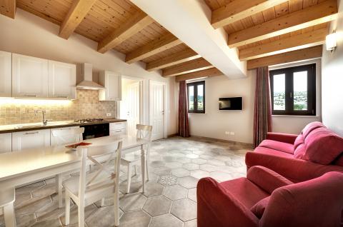 Ieder appartement beschikt over één of meerdere slaapkamers, een woonkamer met keuken en slaapbank en een badkamer met douche. De appartementen zijn smaakvol en modern ingericht en allemaal voorzien van airconditioning, Wifi, vaatwasser, oven en wasmachine. Je kunt hier zowel ontbijten als lunchen of dineren, tussen 01.04 en 31.10 kunnen de eigenaren op verzoek een ontbijt en/of maaltijd verzorgen met verse lokale producten die ze bij je appartement afleveren. De gastvrije, sympathieke familie, eigenaren van het kleinschalige resort hebben ook een boerderij met koeien, voor kinderen extra leuk om een kijkje te nemen.
