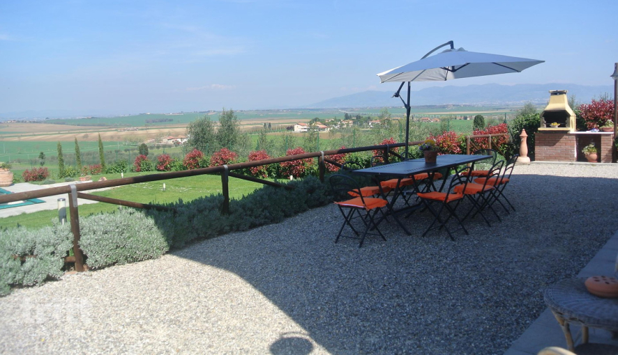 Buiten: De auto wordt geparkeerd binnen het hek op de privé parkeerplaats. Direct voor de villa een groot terras met eettafel en parasol. In de tuin een pergola met zitje en uitzicht op het zwembad en het landschap. Het huis is geschikt voor 6 volwassenen en 2 kinderen tot max. 12 jr. Het vakantiehuis ligt op ca. 10 a 15 autominuten van Camucia waar diverse winkeltjes, supermarkt e.d. te vinden zijn. Ook is hier een gemeentelijke tennisbaan (€). In Foiano della Chiana op ca. 9 km zijn enkele restaurantjes en winkeltjes te vinden. Een grote supermarkt is te vinden in Sinalunga op 15 km van de villa.