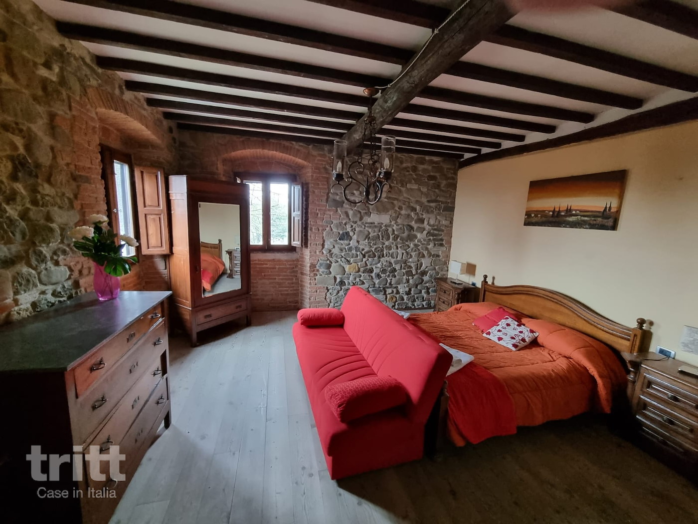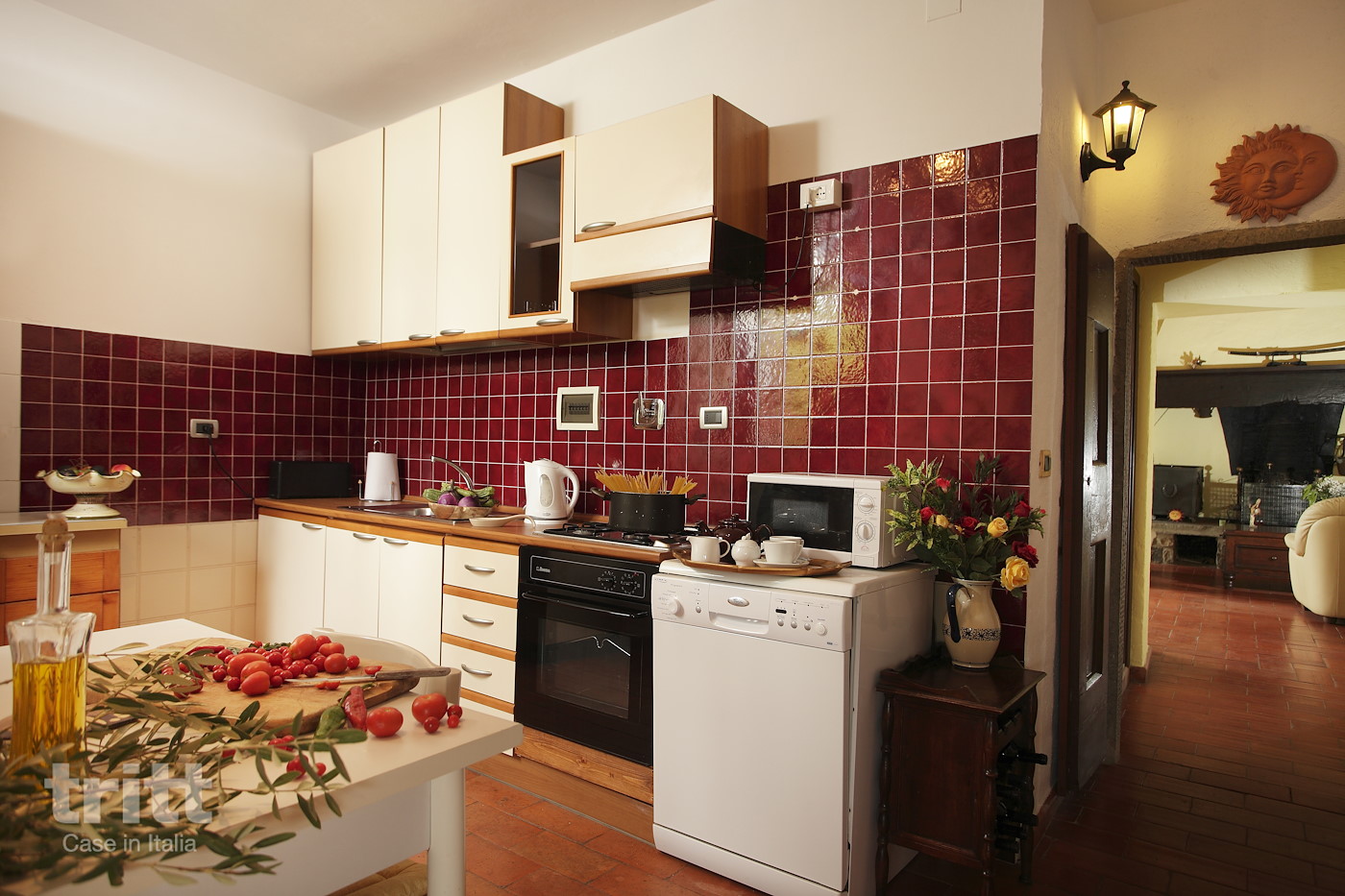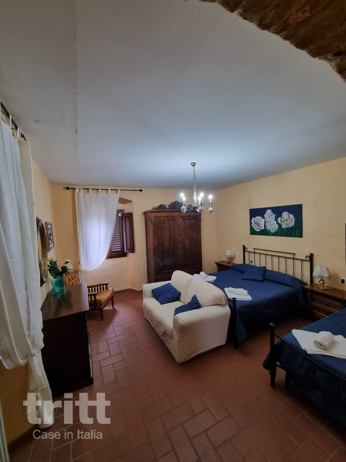 De 5 appartementen liggen verspreid tussen het restaurant, de tennisbaan en de speeltuin. Dit ruime appartement ligt op de eerste verdieping en is bereikbaar via een interne trap. De woonkamer heeft een zithoek en een grote open haard, en in de keuken staat een oven. Vanuit de hal bereikt u het terras met uitzicht over de wijngaarden. Er zijn drie slaapkamers, elk met een tweepersoonsbed, waarvan één met een extra eenpersoonsbed. De twee badkamers zijn uitgerust met douche, wastafel en toilet. Airconditioning is in dit appartement niet aanwezig. Het is een fijne plek voor gezinnen die houden van eenvoud, rust en buitenleven. Kinderen kunnen rondkijken bij de dieren of een rondje over het landgoed maken, terwijl ouders genieten van de stilte en het uitzicht over de heuvels. De appartementen zijn basic ingericht in Toscaanse stijl en beschikken over een eigen terras.De eigenaren wonen zelf op het landgoed en runnen met veel aandacht de keuken en het restaurant. De gastheer kookt dagelijks een eenvoudig seizoensmenu met ingrediënten van het eigen erf en uit de directe omgeving. De desserts worden door de gastvrouw bereid. Bij mooi weer worden de maaltijden geserveerd op het terras bij het zwembad. De opzet is kleinschalig, ontspannen en volledig gericht op authentieke Toscaanse gastvrijheid.