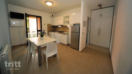 Het ruime appartement bestaat uit 2 met elkaar verbonden gedeelten, ideaal voor grotere gezinnen of gasten die wat extra privacy wensen. De woonkamer heeft een kitchenette, eethoek en televisie, terwijl de drie slaapkamers verdeeld liggen over beide delen van het vakantiehuis. Er zijn 2 badkamers en 2 privéterrassen die uitkijken over de tuin, waardoor je zowel binnen als buiten prettig kunt verblijven. De lichte inrichting en het vele groen rondom zorgen voor een ontspannen sfeer.