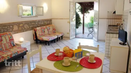 Tussen de bomen en de oude terrassen van het landgoed liggen in totaal 22 appartementen, verdeeld over 4 landhuizen. Het hoofdgebouw ligt direct bij het zwembad, de andere huizen liggen iets hoger in het pijnbomenbos. Het appartement zelf is een praktische studio voor max. 4 personen, gelegen in het hoofdlandhuis. Je beschikt over een eenvoudig keukenblok met 2-pits kookplaat, koelkast en Italiaans koffiezetapparaatje, twee 2-persoonsbedbanken, een badkamer met douche en een klein overdekt terras. Bij het zwembad geniet je van een fijn zonneterras en ruime ligplekken, met uitzicht op de groene heuvels. Voor de jongste kinderen is er een apart kinderbad en een speelplaats, terwijl oudere kinderen en ouders zich vermaken bij de tennisbaan, tafeltennistafel of fitnessruimte. Het strand bereik je binnen enkele minuten op de fiets, waardoor de auto gerust een dag stil kan blijven staan. Een lokaal restaurant bevindt zich op slechts 100 meter van het park. De stranden Spiaggia di Barabarca en Spiaggia Zuccale liggen op circa 1 km afstand.