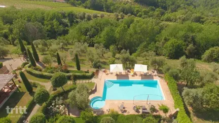 Deze omheinde vakantieboerderij bestaat uit meerdere wooneenheden die samen of deels te huur zijn, afhankelijk van het seizoen, en is daardoor bijzonder geschikt voor 2 gezinnen of een groter gezelschap tot 12 volwassenen en 4 kinderen. De appartementen zijn verdeeld over 2 woonlagen en ingericht in klassieke Toscaanse stijl met terracotta vloeren en houten balkenplafonds. Elk appartement beschikt over een eigen woonkamer met open haard, een complete keuken met oven, koelkast, vaatwasser en wasmachine en meerdere slaapkamers met bijbehorende badkamers. Daarnaast is er een vrijstaand huisje met eigen entree, een compacte maar complete keuken, een slaapkamer en een privé terras met uitzicht over het landschap. Buiten vind je ruime privé tuinen met pergola en barbecue, terwijl het gezamenlijke zwembad met bubbelbad, comfortabele ligbedden en buitendouche uitnodigt tot ontspannen dagen in de zon. Voor kinderen is er een speelruimte en een klein speeltuintje, en biologische groenten en fruit zijn direct op het landgoed verkrijgbaar.