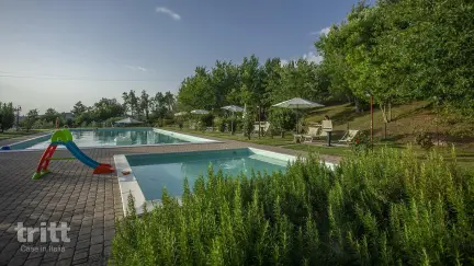 Het domein beslaat ruim 48 hectare waarop op volledig biologische wijze olijven, druiven, granen en andere gewassen worden verbouwd. De druiven worden hier verwerkt tot hoogwaardige wijnen en Grappa, terwijl de olijven zorgen voor een uitzonderlijke olijfolie van eigen bodem. Op het terrein ligt een historische boerderij die is gerestaureerd tot meerdere sfeervolle appartementen. Dit ruime driekamerappartement ligt op de begane grond en is ondergebracht in een voormalig bijgebouw van de boerderij. Binnen vindt u een gezellige woonkamer met keukenhoek en eethoek. De eerste slaapkamer beschikt over een tweepersoonsbed en een aangrenzende badkamer met ligbad. De tweede slaapkamer heeft twee eenpersoonsbedden en er is een extra badkamer met douche. Dankzij de tweepersoonsslaapbank in de woonkamer kunnen hier tot zes personen comfortabel verblijven. Buiten beschikt het appartement over een overdekt terras met pergola en een prachtig uitzicht over het zwembad en de groene landerijen. Het is een heerlijke plek om te ontbijten in de ochtendzon of ’s avonds te genieten van een Toscaanse wijn afkomstig van het landgoed zelf. Centraal op het domein ligt een zoutwater zwembad met ruim zonneterras en comfortabele ligstoelen. Vanaf hier kijkt u uit over de omliggende heuvels die zo typerend zijn voor dit deel van Toscane. Het is een heerlijke plek om tot rust te komen na een dag vol uitstapjes, of om simpelweg te genieten van het uitzicht en de stilte van het Toscaanse platteland. Verspreid over het landgoed vindt u bossen, wijngaarden, kleine meertjes en verschillende wandelpaden die met elkaar verbonden zijn. Wie meer wil leren over het landgoed kan deelnemen aan speciale activiteiten in het hoogseizoen, zoals rondleidingen door de wijngaarden, proeverijen of yogalessen tussen de olijfbomen, altijd bij voldoende deelname.