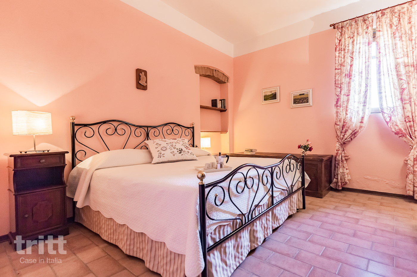 Deze karaktervolle vakantieboerderij ligt op een ruim landgoed en bestaat uit meerdere appartementen. Het appartement voor 5 personen bevindt zich op de begane grond en heeft een rustige, panoramische ligging. Binnen is het warm en comfortabel ingericht met een woonkamer met zitbank, tv, eethoek en open haard. Er zijn 2 slaapkamers, waarvan één met een tweepersoonsbed en één met 3 eenpersoonsbedden, en een badkamer met douche. Buiten in de tuin is een privéplek met tafel en stoelen gereserveerd. Op het terrein is een zwembad van 6 x 12 m en worden wijn en extra vergine olijfolie geproduceerd, die ook ter plaatse te proeven zijn.