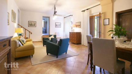 Deze karaktervolle vakantieboerderij ligt op een ruim landgoed en bestaat uit meerdere appartementen. Het appartement voor 6 personen bevindt zich op de eerste verdieping en is ruim en comfortabel ingericht. Binnen is er een lichte woonkamer met open haard, eethoek en keukenhoek, ideaal om samen te koken en te ontspannen. Het appartement beschikt over 3 slaapkamers, elk met een tweepersoonsbed en een eigen badkamer met douche, wat zorgt voor extra comfort en privacy. Buiten, onder aan de trap, ligt een royaal terras op een rustige plek met prachtig uitzicht over de heuvels. Op het terrein is een zwembad van 6 x 12 m en worden wijn en extra vergine olijfolie geproduceerd.