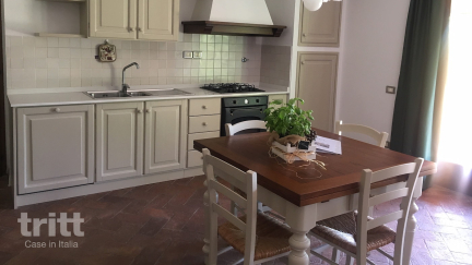 Het appartement Capanna ligt in een van de landelijke bijgebouwen die ooit dienst deden als hooischuur en opslag. Het strekt zich uit over twee niveaus. Op de begane grond vind je een lichte woonruimte met tweepersoonsslaapbank, twee comfortabele stoelen en een praktische keukenhoek met kookplaat, oven, koelkast en vaatwasser. Er is tevens een apart toilet. Via een deur stap je direct het overdekte terras op, ingericht met tafel en stoelen en uitkijkend op de tuin en de omliggende heuvels. Op de verdieping bevinden zich twee slaapkamers: één met tweepersoonsbed en één met twee losse bedden, plus een badkamer met douche. Het geheel ademt een warme, landelijke sfeer en vormt een fijne thuisbasis na een dag in de Toscaanse buitenlucht.