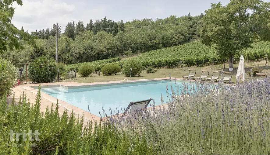 In de tuin ligt een panoramisch zwembad met uitzicht over de wijngaarden, een plek waar je het Toscaanse landschap bijna kunt ruiken. De tuin is speels aangelegd met meerdere niveaus, waar je knusse hoekjes, bankjes in de schaduw en zelfs een hangmat vindt. Voor de kinderen zijn er speelplekken en een tafeltennistafel.