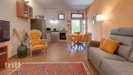 Het appartement is ruim en geschikt voor 6 personen (4+2 pers.). Binnen vind je een comfortabele woonkamer met slaapbank, televisie en eethoek, en een volledig ingerichte keuken met oven, vaatwasser, koelkast met vriesvak en 4-pits kookplaat. Er zijn twee slaapkamers, één met een tweepersoonsbed en één met twee eenpersoonsbedden, en twee badkamers met douche. Buiten ligt een betegeld terras met tuinmeubilair, perfect voor een avond onder de Toscaanse sterrenhemel. Airconditioning en raamhorren zorgen voor extra comfort.