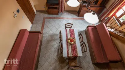 Het appartement ligt op de eerste verdieping en biedt een lichte woonruimte met keukenhoek en een comfortabele slaapbank. Er zijn twee badkamers en twee slaapkamers, waarvan één met tweepersoonsbed en één met twee eenpersoonsbedden. Via een trap bereik je de open slaapvide met twee extra bedden, ideaal voor grotere gezinnen. De inrichting is eenvoudig en authentiek, passend bij de Toscaanse omgeving.