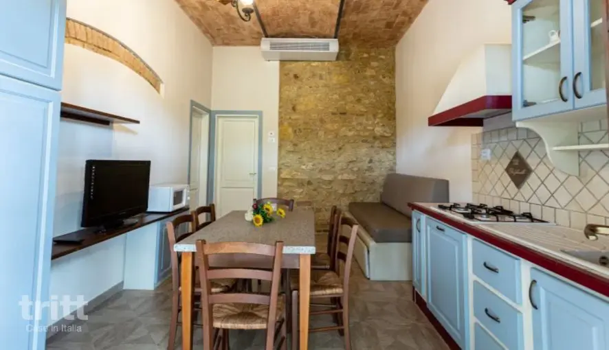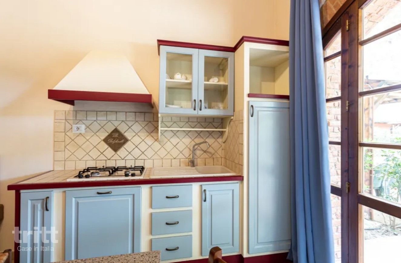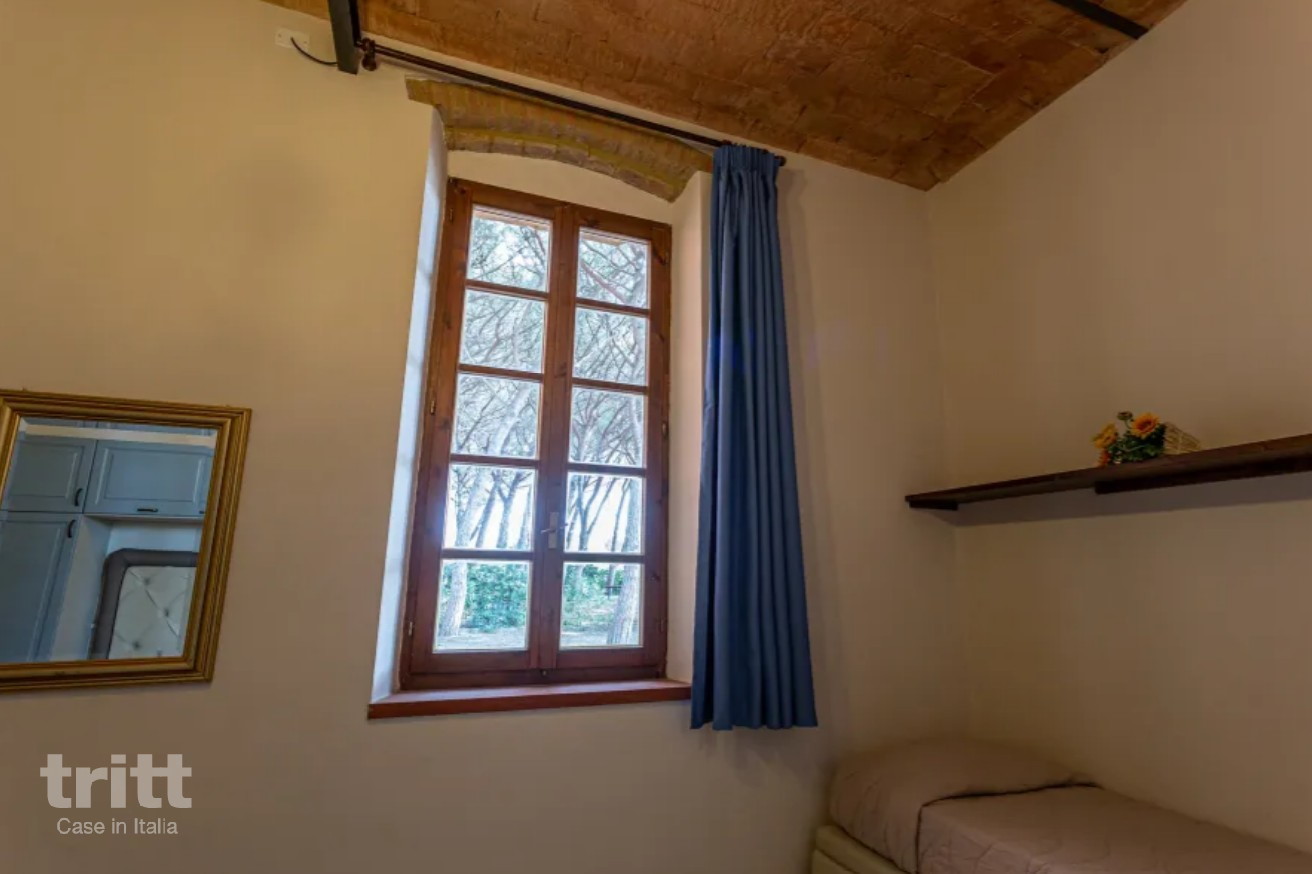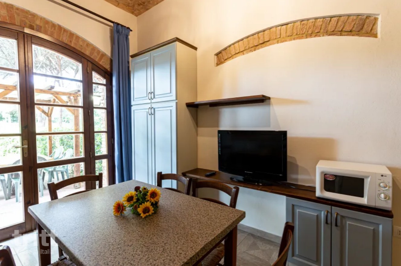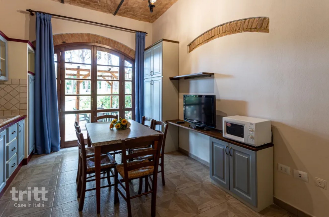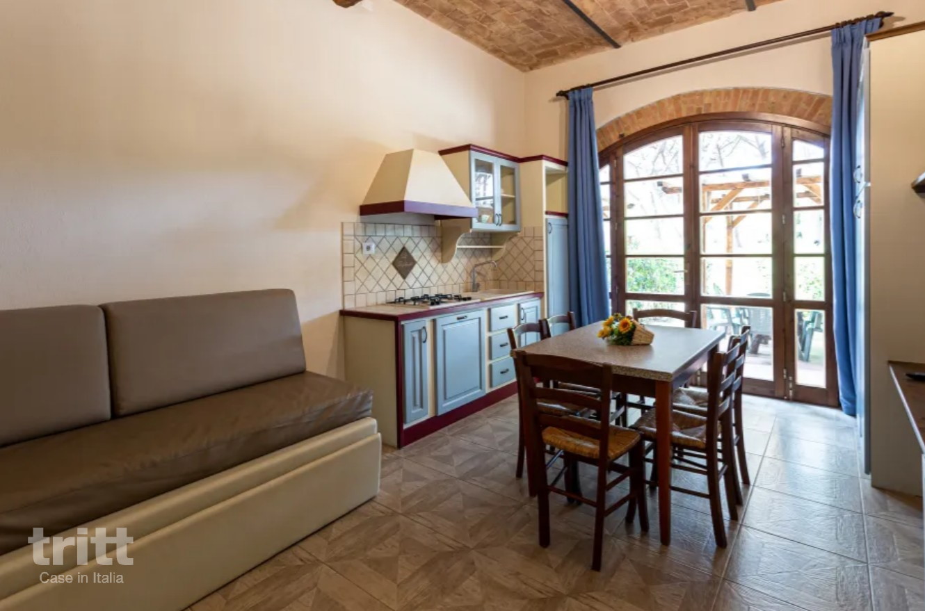 Het appartement ligt op de begane grond en ademt de eenvoudige charme van Toscane, met een woongedeelte met keukenhoek en een extra slaapbank voor kinderen. De slaapkamer biedt een tweepersoonsbed en een stapelbed, ideaal voor gezinnen die samen willen verblijven. Buiten wacht een terras met houten pergola en tuinmeubilair, perfect voor ontspannen momenten in de schaduw van het bos. Als gast maak je bovendien gebruik van het zwembad, de bar en de speelgelegenheden van een nabijgelegen terrein.