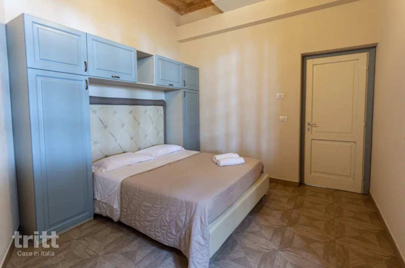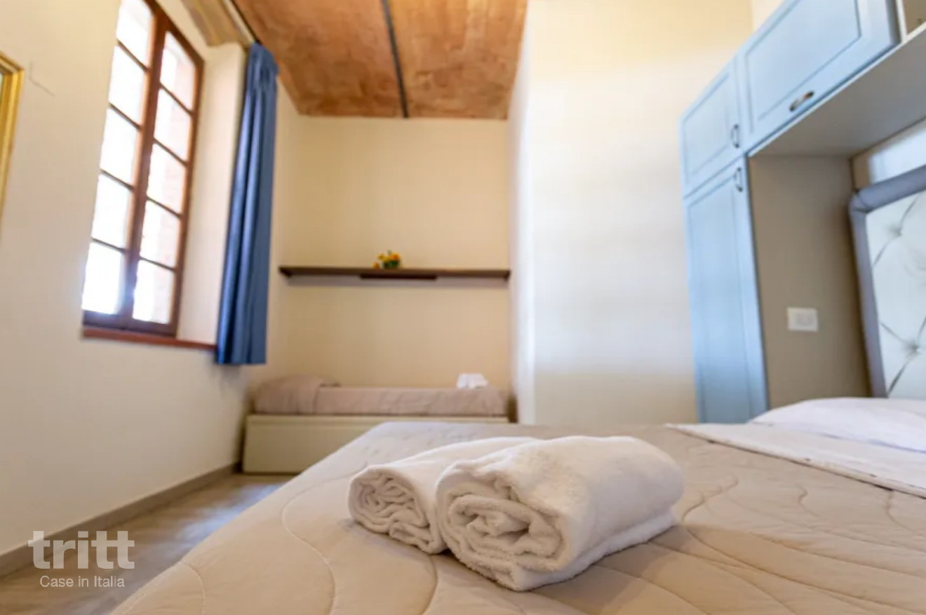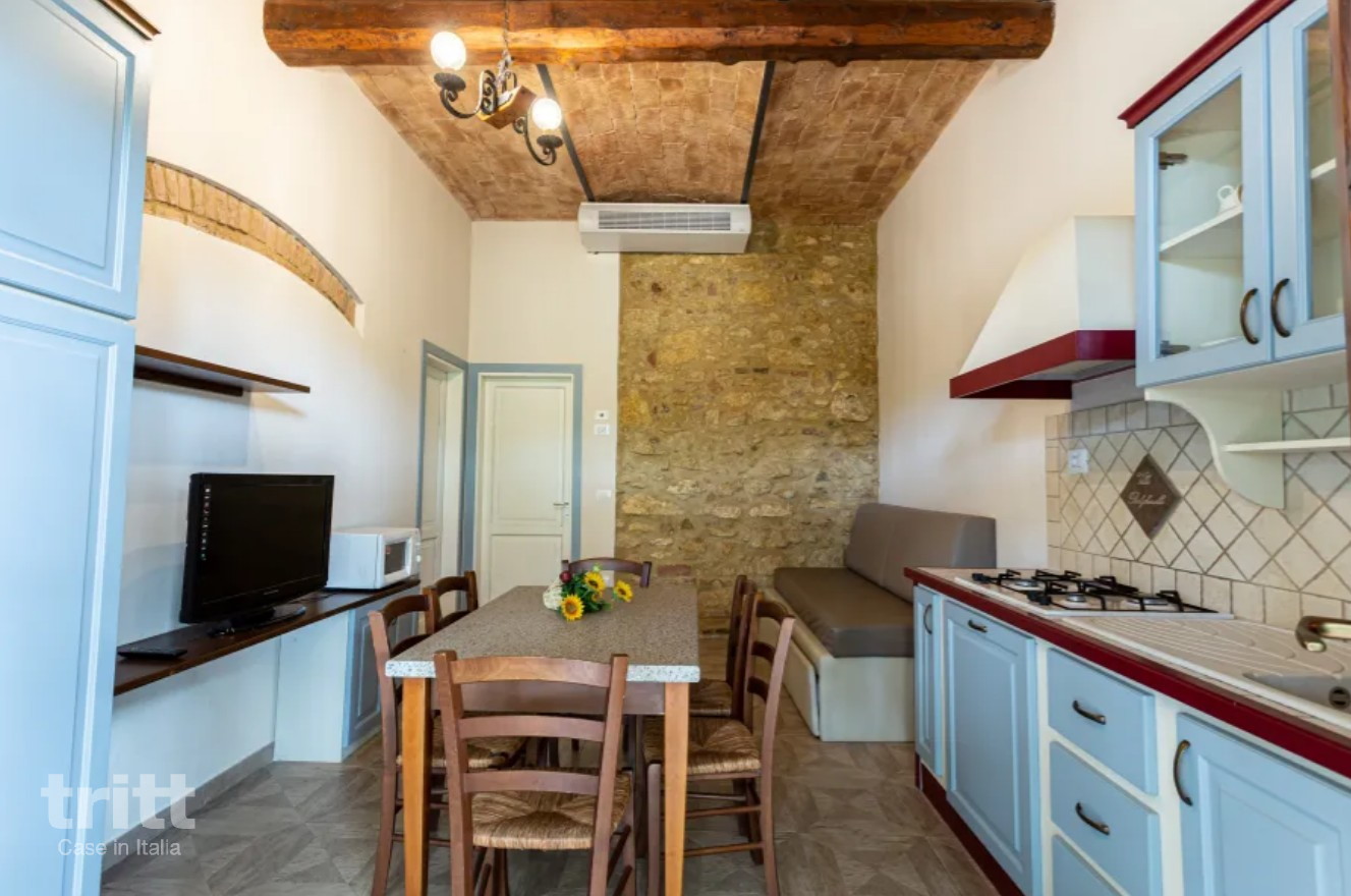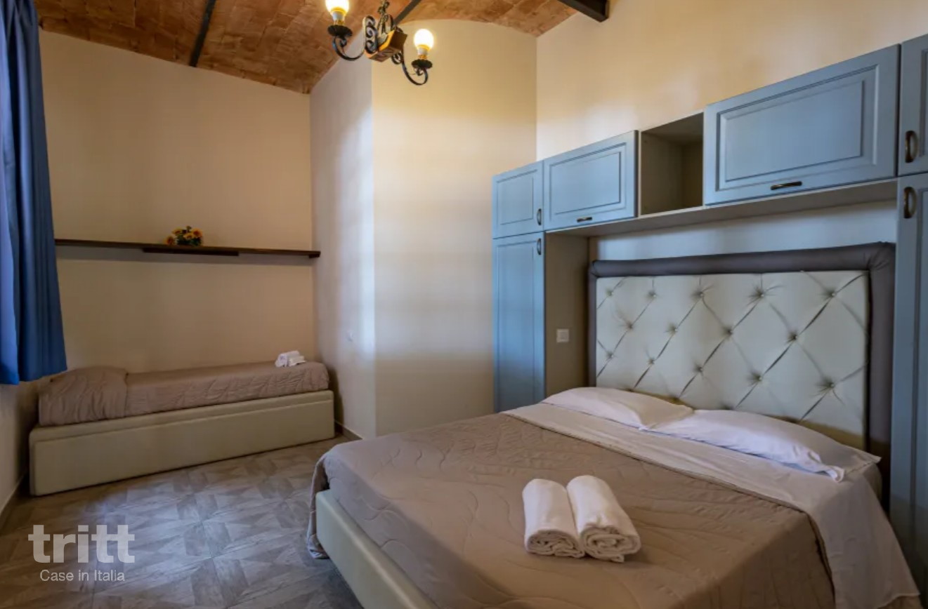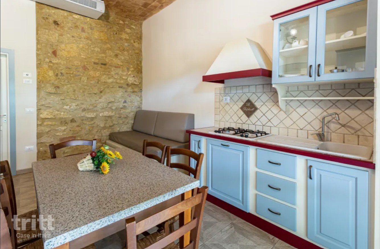 Het appartement ligt op de begane grond en ademt de eenvoudige charme van Toscane, met een woongedeelte met keukenhoek en een extra slaapbank voor kinderen. De slaapkamer biedt een tweepersoonsbed en een stapelbed, ideaal voor gezinnen die samen willen verblijven. Buiten wacht een terras met houten pergola en tuinmeubilair, perfect voor ontspannen momenten in de schaduw van het bos. Als gast maak je bovendien gebruik van het zwembad, de bar en de speelgelegenheden van een nabijgelegen terrein.