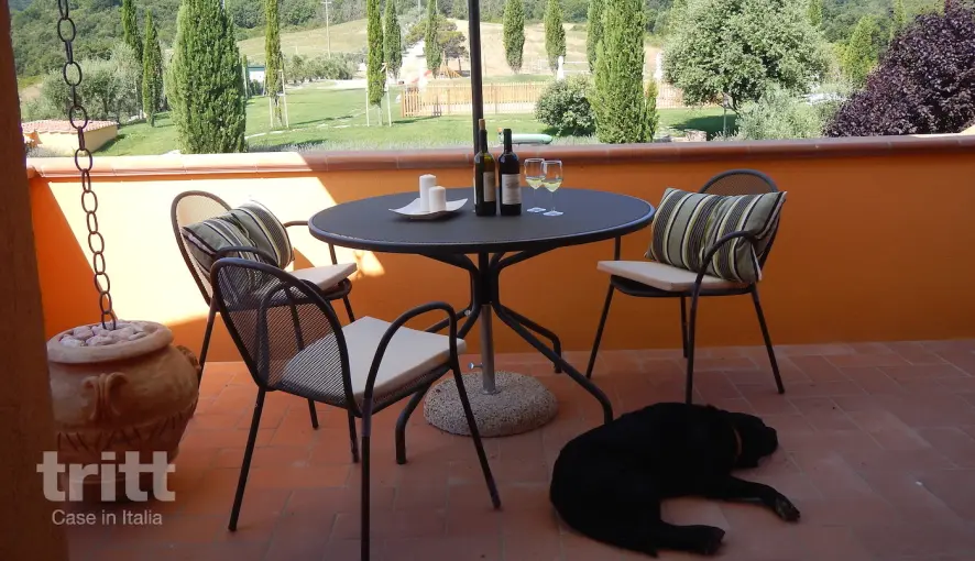 Het knusse appartement is gelegen op de eerste verdieping en bereikbaar via een externe trap. Binnen vind je een gezellige woonkamer met zithoek, tv en eethoek, en een keukenblok met 4-pitskookplaat, oven en koelkast met vriesvak. De slaapkamer is voorzien van een tweepersoonsbed en een open hoek met stapelbed, waardoor het appartement standaard geschikt is voor 4 personen. De badkamer heeft een douche en de slaapkamer beschikt over een ventilator. Buiten wacht een eigen terras met tuinmeubilair en parasol, waar je kunt genieten van het uitzicht over de Toscaanse heuvels.