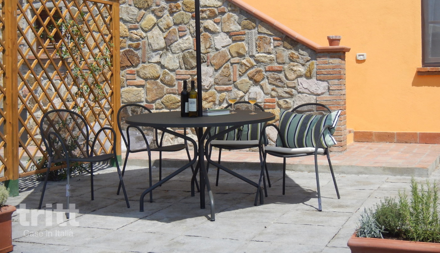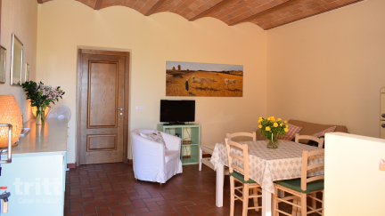 Het appartement ligt op de begane grond van de boerderij, aan de kant van de velden en weiden, en heeft een gezellige woonkamer met zithoek en tv. De eethoek grenst aan een keukenblok met 4-pitskookplaat, oven en koelkast met vriesvak. De slaapkamer is voorzien van een tweepersoonsbed en een ventilator, terwijl de (eenpersoons)slaapbank in de woonkamer extra slaapgelegenheid biedt voor een kind. De badkamer beschikt over een douche. Buiten vind je een privéterras met tuinmeubilair en parasol, een fijne plek om te ontspannen en te genieten van het Toscaanse landschap.