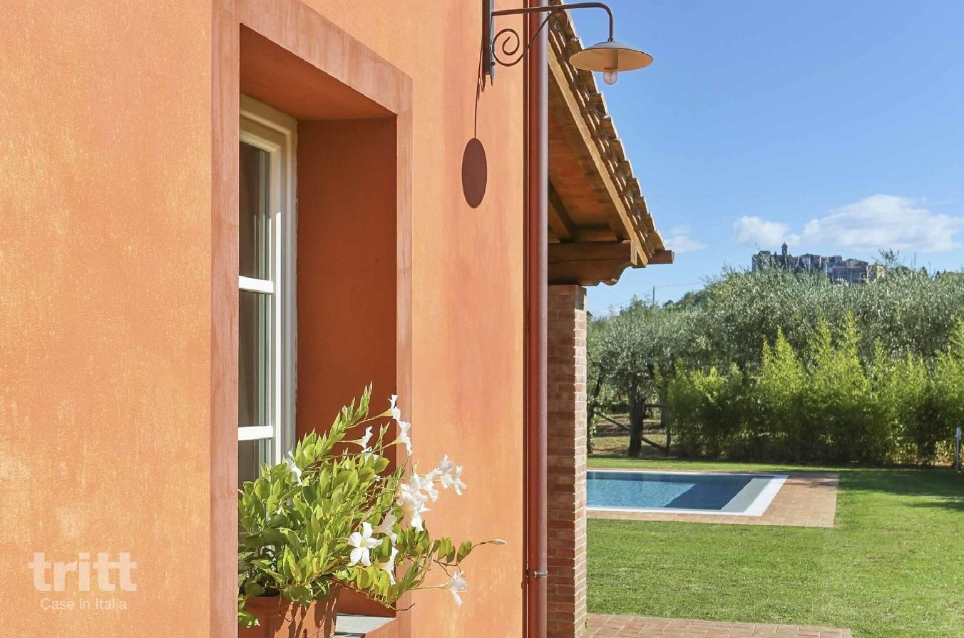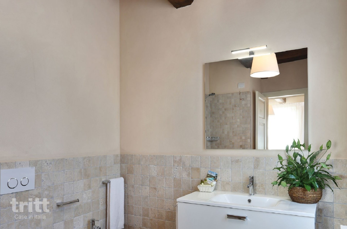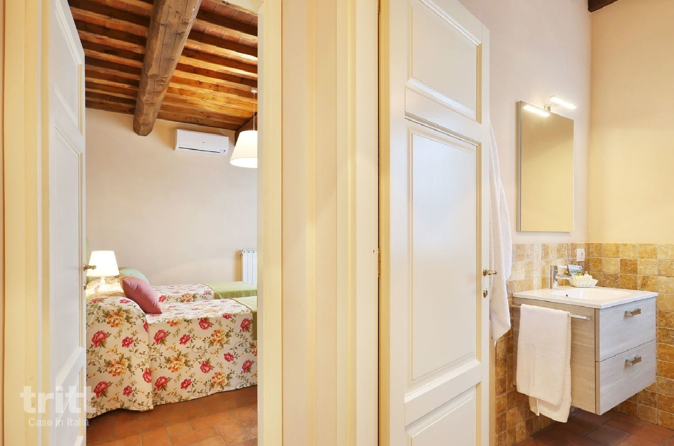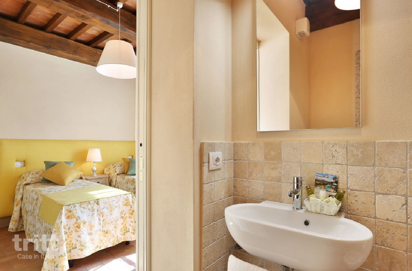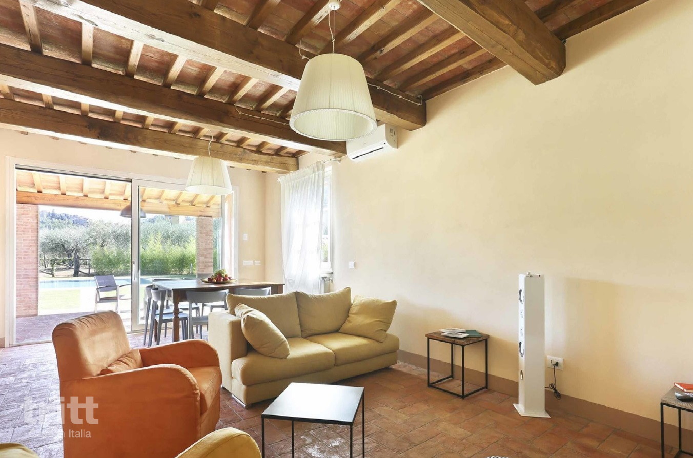 Deze villa is geschikt voor 9 personen en is licht en verzorgd ingericht. Op de begane grond bevindt zich de woonkamer met zithoek, tv en eethoek, naast de keuken die is uitgerust met een 5-pits kookplaat, oven, magnetron, vaatwasser, grote koelkast met vriesgedeelte, Nespresso-apparaat, mokà koffiezetter en broodrooster. Op deze verdieping liggen ook een slaapkamer met 2 eenpersoonsbedden en airconditioning en een eenpersoonsslaapkamer, die samen een badkamer met douche en toilet delen. De eenpersoonsslaapkamer beschikt niet over airconditioning, alle andere slaapkamers wel Daarnaast is er een wasruimte met wasmachine, strijkplank en strijkijzer. Op de verdieping bevinden zich 3 slaapkamers, waarvan 2 met tweepersoonsbed en 1 met 2 eenpersoonsbedden, elk met een eigen badkamer met douche, toilet en haardroger. Buiten nodigt de grote veranda uit tot lange maaltijden en ontspannen momenten, met een eettafel, tuinmeubilair en barbecue. In de tuin ligt het privé zwembad met zonneterras en ligstoelen, omgeven door olijfbomen en schaduwrijke plekken. De auto's kunnen gemakkelijk geparkeerd worden bij de villa.