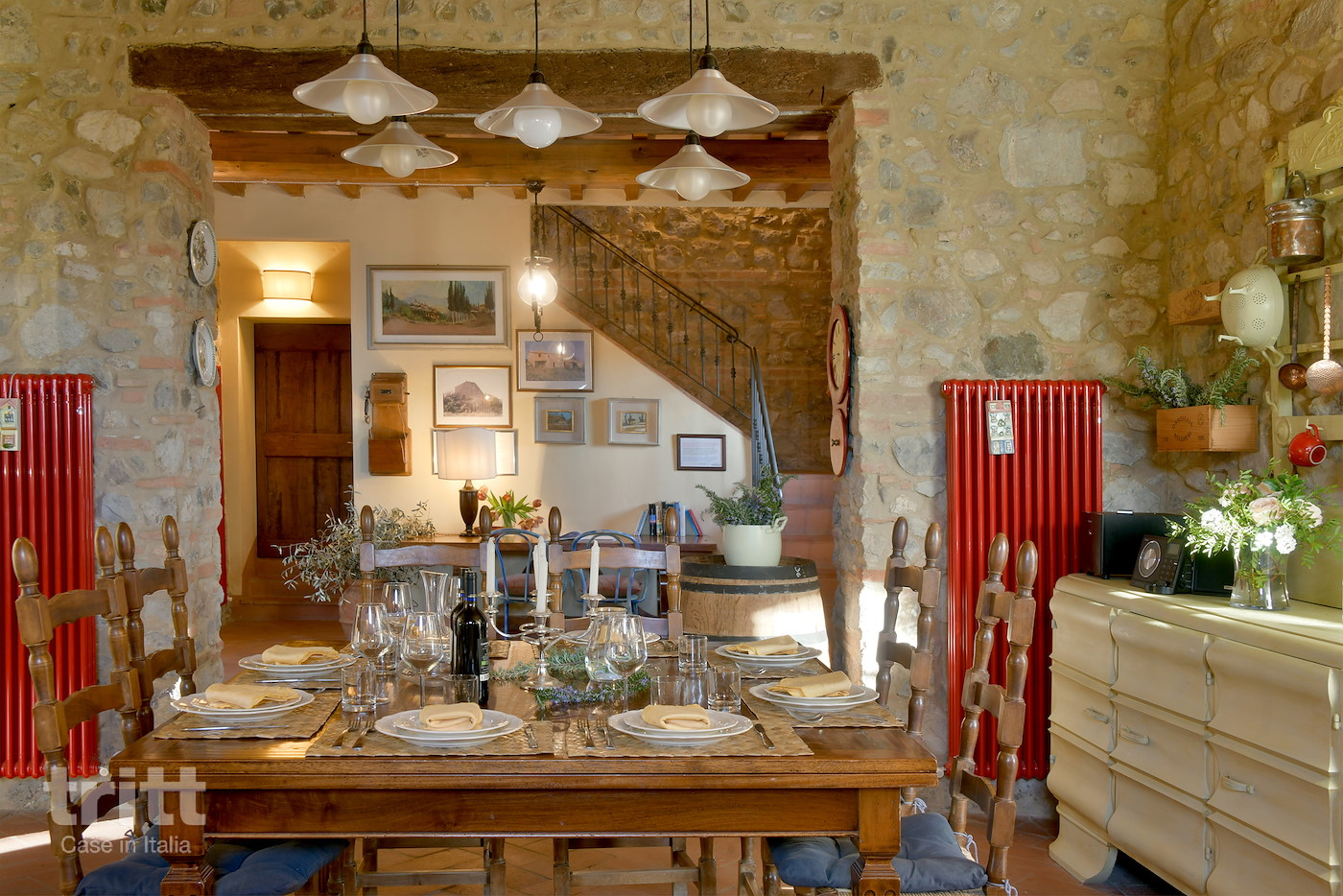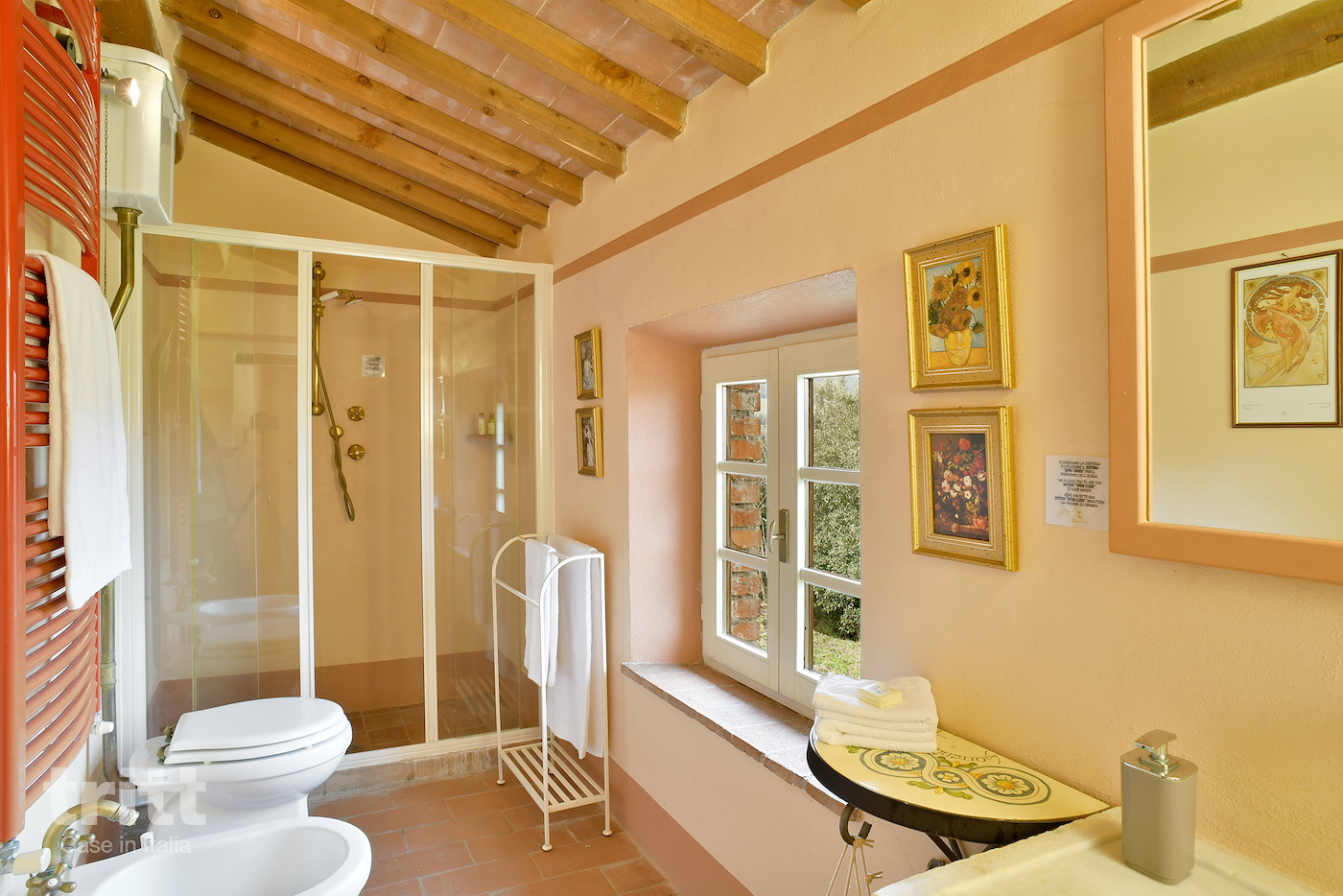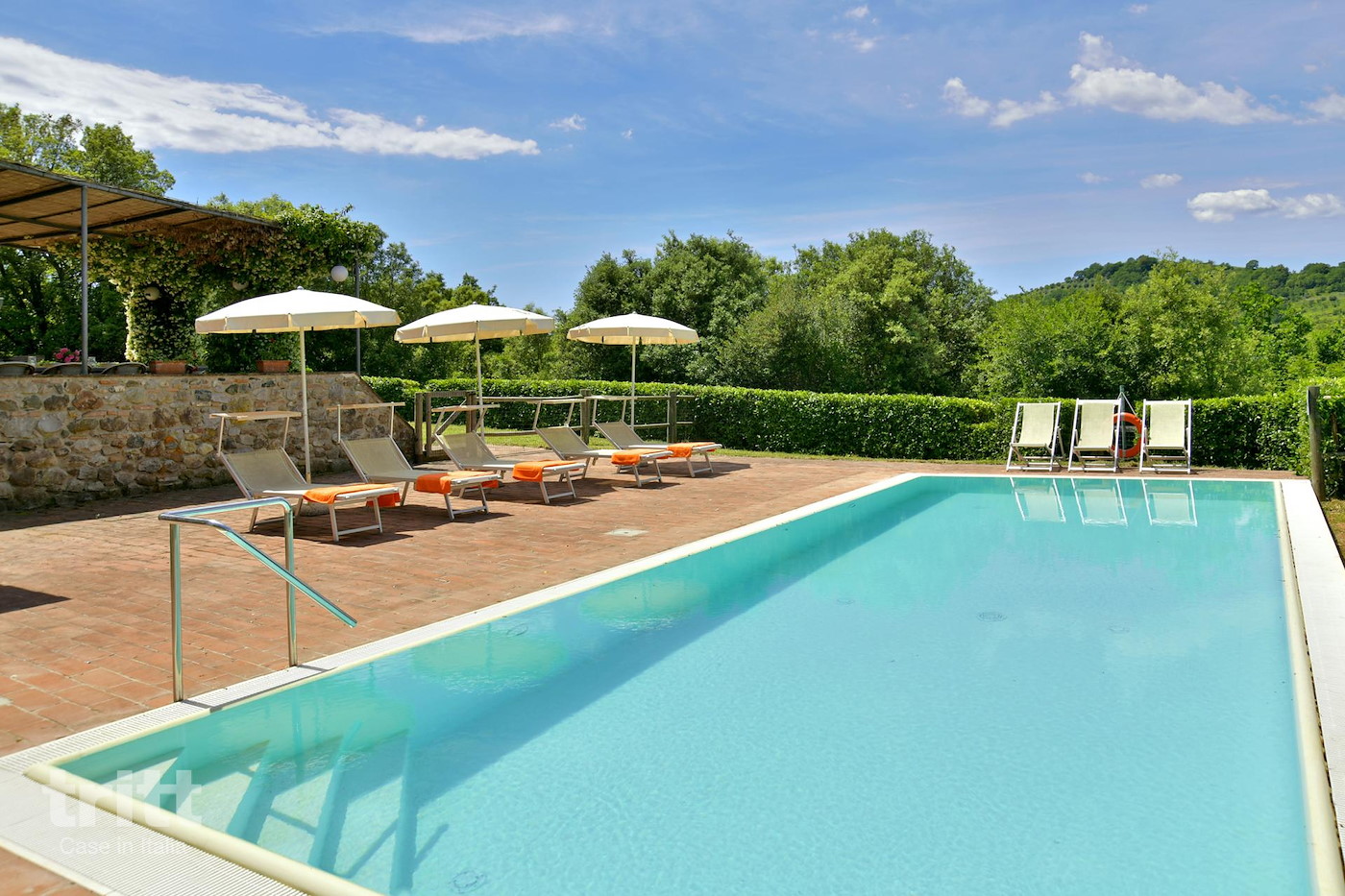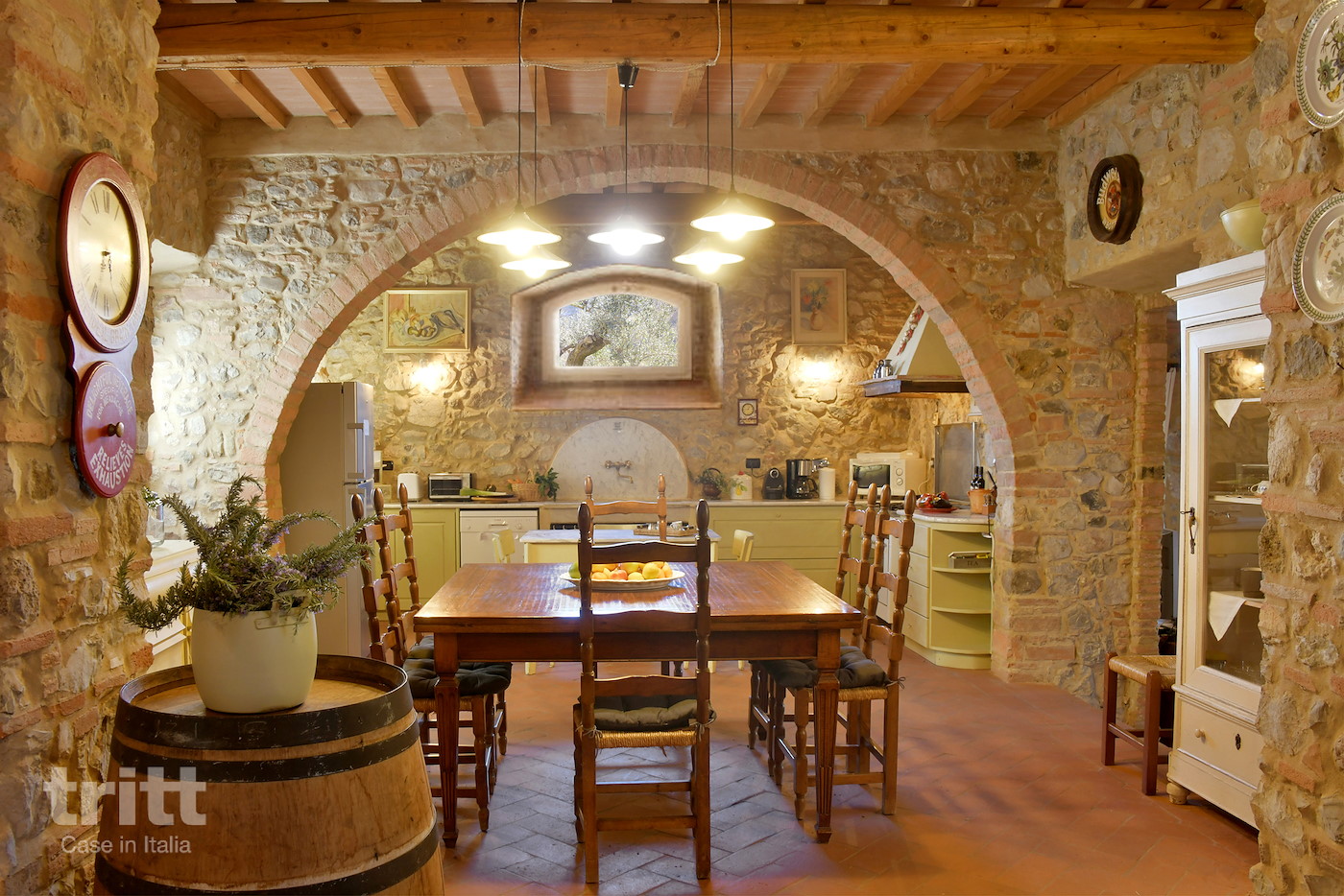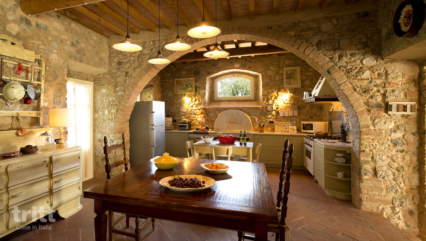 Deze karaktervolle boerderij van natuursteen biedt ruimte aan 10 personen en is ingericht in warme Toscaanse stijl. Op de begane grond ligt de gezellige woonkamer met zithoek, open haard en satelliet-tv, met openslaande deuren naar het terras. Enkele treden lager bevindt zich de woonkeuken met eethoek, die direct aansluit op de tuin. De keuken is voorzien van een 5-pits fornuis met oven, koelkast, magnetron, vaatwasser, (filter)koffiezetapparaat en broodrooster. Vanuit de keuken heb je toegang tot het terras en de tuin. Op de begane grond ligt tevens een slaapkamer met tweepersoonsbed en aangrenzende badkamer. Via een trap bereik je de andere 3 slaapkamers op de verdieping. Twee daarvan hebben een tweepersoonsbed met beiden een aangrenzende badkamer, de andere slaapkamer heeft 4 eenpersoonsbedden en ook een eigen badkamer. Alle badkamers zijn voorzien van douche , toilet en wastafel. Het vakantiehuis is in Toscaanse stijl aangenaam en sfeervol ingericht. Buiten nodigt de ruime tuin uit tot lange dagen in de zon, met een privé zwembad dat in koelere maanden verwarmd kan worden, meerdere terrassen, een veranda met lange eettafel en een stenen barbecue met pizzaoven. Alle ramen beschikken over horren en beneden is er wifi.