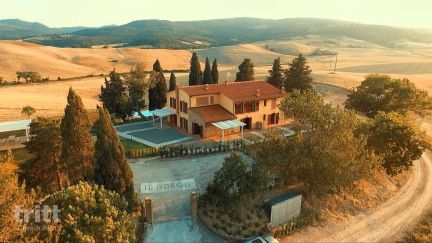 Behalve een gebouw met de 5 appartementen, staan er op het grondstuk ook 2 villas, deze kunt u hier en hier bekijken. Het geheel wordt afgesloten door een hek. Zoals u op de foto kunt zien, ligt de agriturismo heel rustig midden op het platteland van Toscane, omringd door een prachtig glooiend landschap, een auto is echter wel noodzakelijk, ook om boodschappen te doen. U bereikt de structuur via een eigen weg, onverhard.