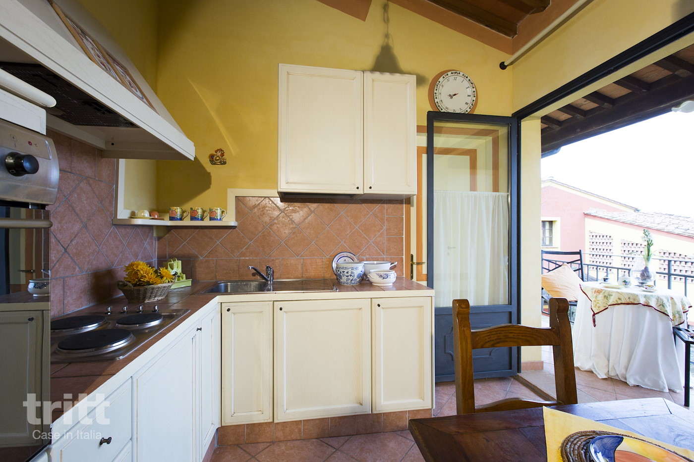 Via een stenen binnentrap komt u bij het woongedeelte met een tweepersoonsbed en een zitsslaapbankje, satelliet-tv, eethoek en een keukenhoek met 3-pitskookplaat (elektrisch), koelkast met vriesvak, combimagnetron en mokà (Italiaans koffiezetapparaatje, geen filter). De badkamer is uitgerust met douche, toilet, bidet, wastafel en föhn. Het appartement beschikt over een rustig overdekt balkon met tuinmeubilair en uitzicht op de tuin.