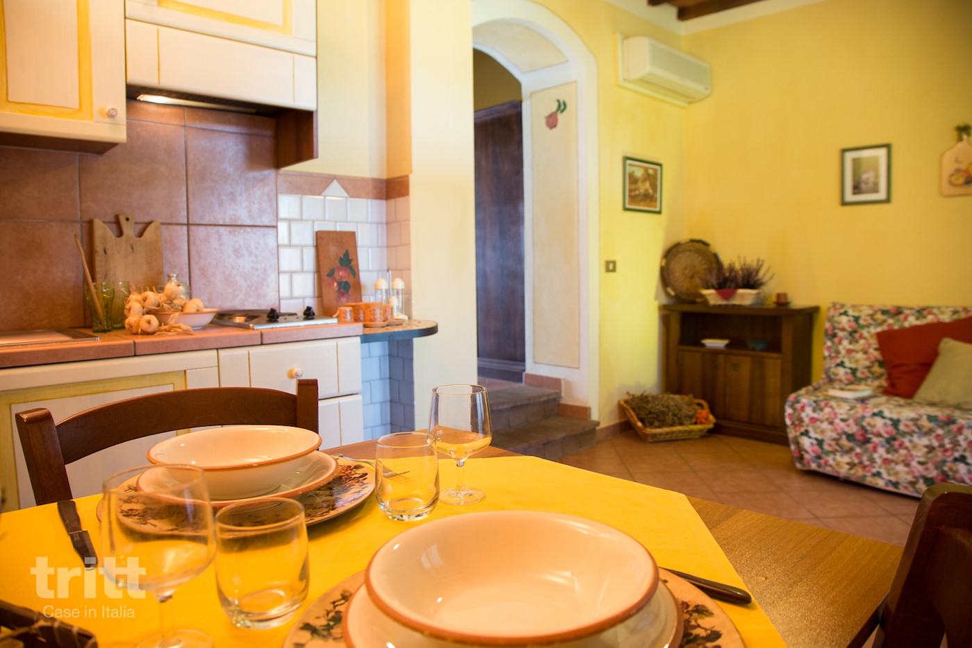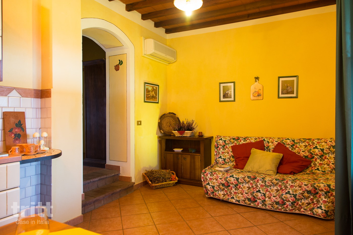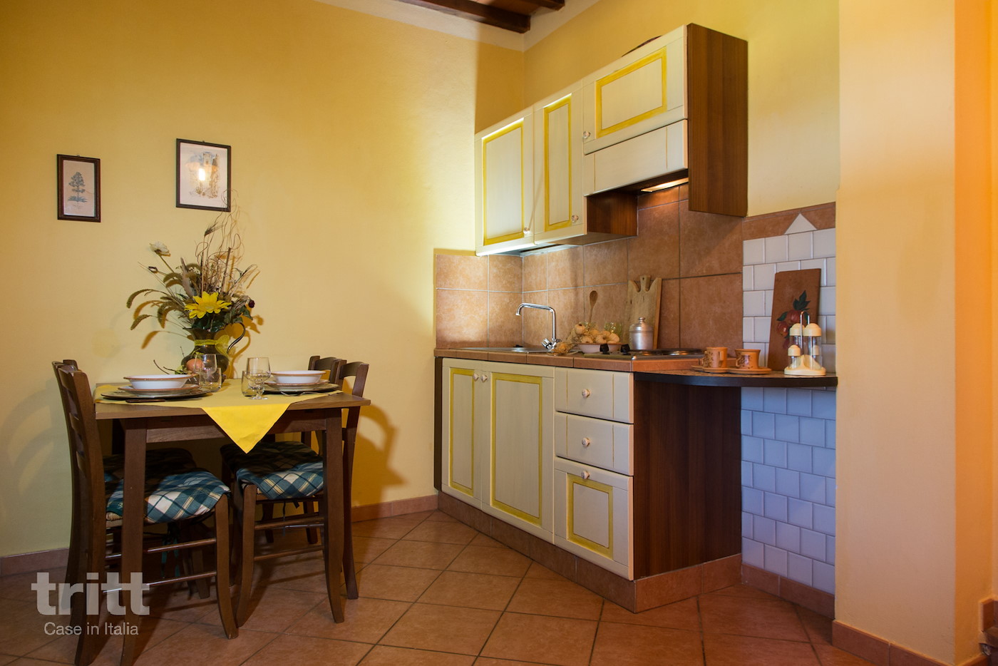 Het appartement is geschikt voor 4 personen en heeft een warme, eenvoudige inrichting in typische Toscaanse stijl. Het woongedeelte biedt een eethoek en een tweepersoonsslaapbank, naast een compacte keuken met 3-pitskookplaat, combimagnetron, koelkast met vriesvak en een Italiaanse mokà. Via openslaande deuren stap je het overdekte terras op met tuinmeubilair en uitzicht over de tuin en het heuvellandschap. Twee treden hoger ligt de slaapkamer met tweepersoonsbed en een extra comfortabele slaapbank, voorzien van satelliet-tv en directe toegang tot de tuin. De badkamer beschikt over douche, toilet, bidet, wastafel en föhn. Dit appartement heeft bovendien een tussendeur naar een aangrenzend appartement, zodat het ook samen als groter vierkamerappartement gereserveerd kan worden.