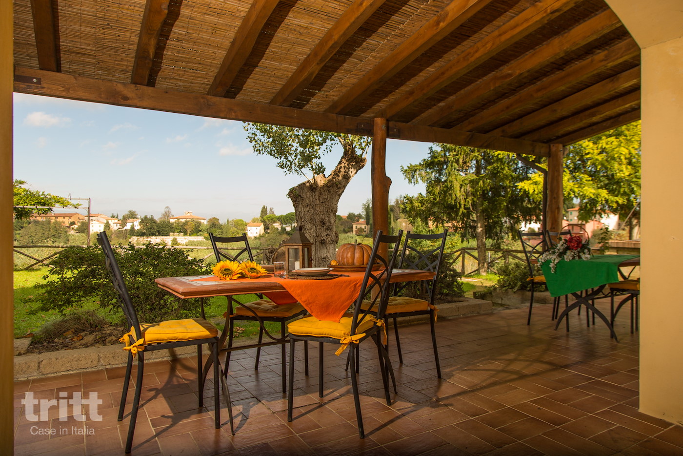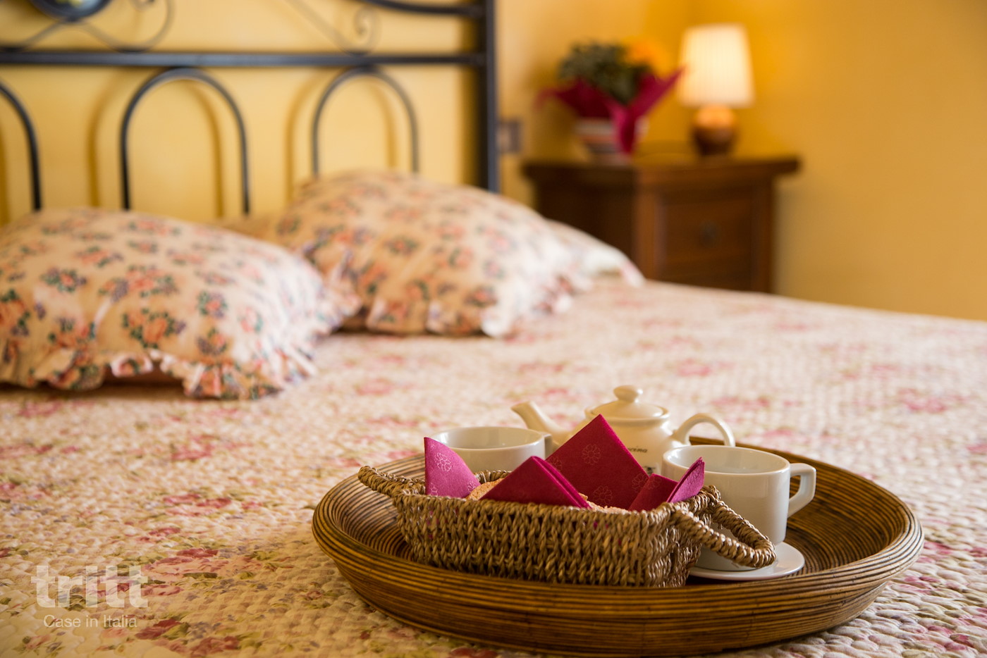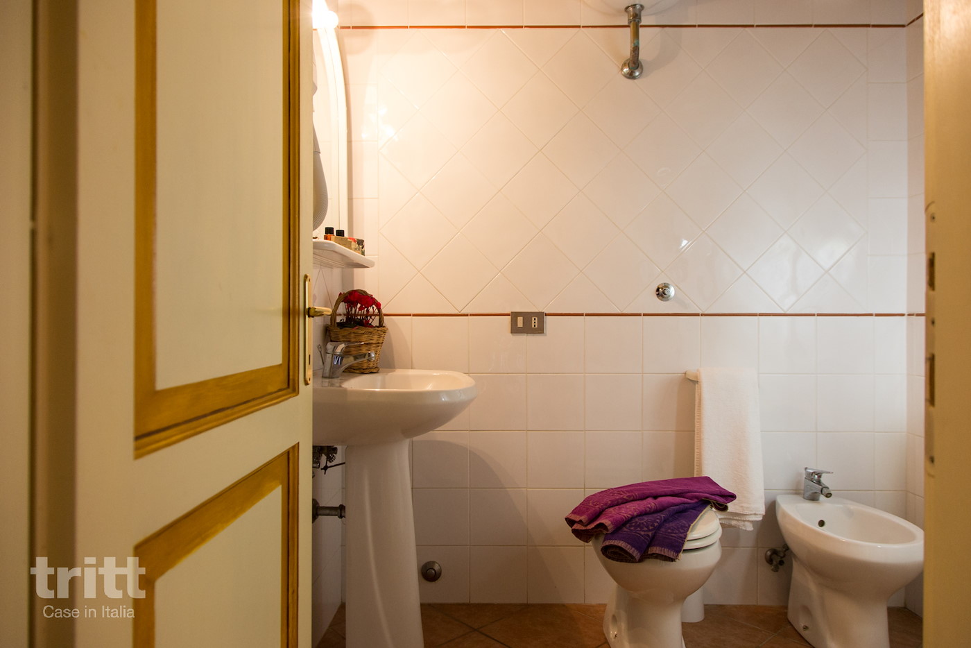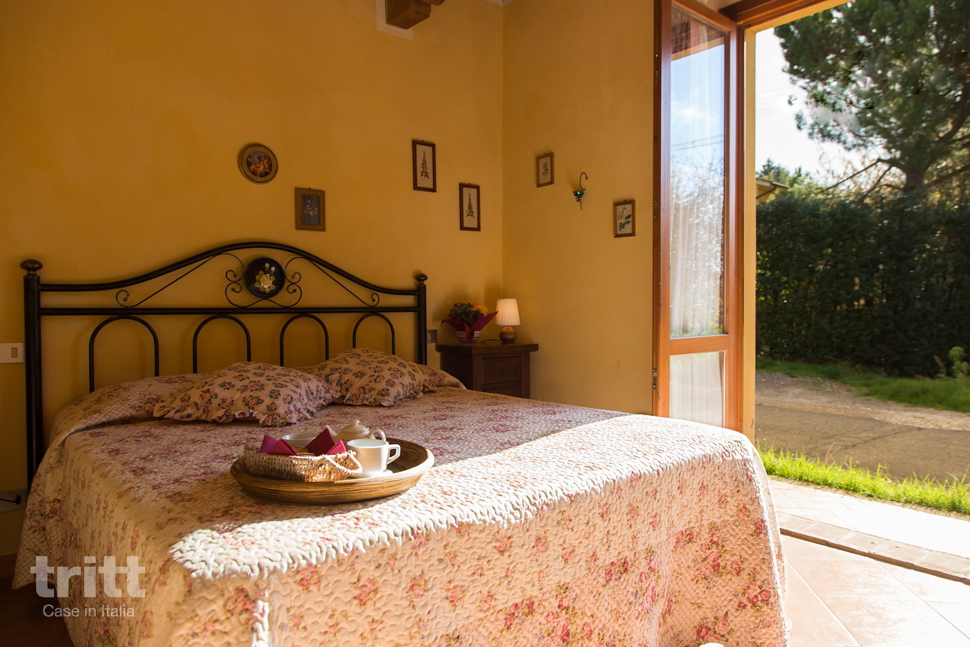 Het appartement is geschikt voor 4 personen en heeft een warme, eenvoudige inrichting in typische Toscaanse stijl. Het woongedeelte biedt een eethoek en een tweepersoonsslaapbank, naast een compacte keuken met 3-pitskookplaat, combimagnetron, koelkast met vriesvak en een Italiaanse mokà. Via openslaande deuren stap je het overdekte terras op met tuinmeubilair en uitzicht over de tuin en het heuvellandschap. Twee treden hoger ligt de slaapkamer met tweepersoonsbed en een extra comfortabele slaapbank, voorzien van satelliet-tv en directe toegang tot de tuin. De badkamer beschikt over douche, toilet, bidet, wastafel en föhn. Dit appartement heeft bovendien een tussendeur naar een aangrenzend appartement, zodat het ook samen als groter vierkamerappartement gereserveerd kan worden.