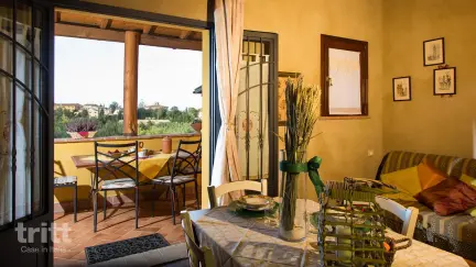 Het appartement is geschikt voor 5 personen en beschikt over een gezellig woongedeelte met tweepersoonsslaapbank, eethoek en keuken met 3-pitskookplaat (elektrisch), combimagnetron, koelkast met vriesvak en een mokà voor Italiaanse koffie. Openslaande deuren leiden naar het overdekte terras met tuinmeubilair en uitzicht over de tuin en het dorp. Twee treden hoger ligt de slaapkamer met tweepersoonsbed, een extra comfortabele slaapbank en satelliet-tv, eveneens met directe toegang tot de tuin. De badkamer is voorzien van douche, toilet, bidet, wastafel en föhn.