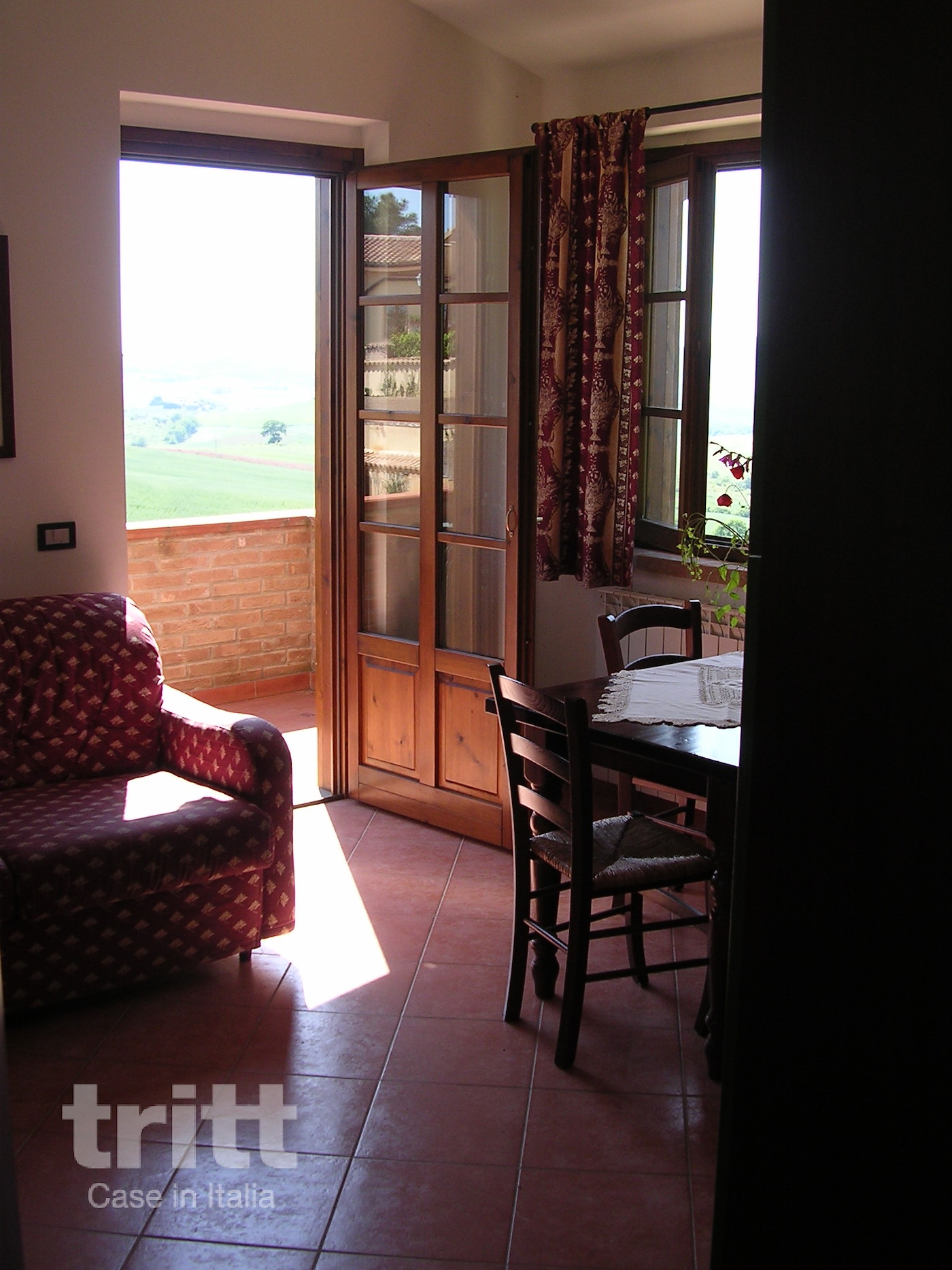 Dit gezellige appartement voor 4 personen is gelegen op de 1e verdieping. Het woongedeelte beschikt over een zitbank, eethoek en een keuken met koelkast met apart vriesgedeelte een kookplaat magnetron en koffiezetapparaat. Er is een slaapkamer met een tweepersoonsbed en een slaapkamer met twee eenpersoonsbedden. De badkamer is voorzien van een douche, toilet en bidet. Buiten heb je een privéterras met zitje en een prachtig uitzicht over het Toscaanse heuvellandschap. Via een pad of een stenen trap bereik je in enkele minuten het zwembad en het restaurant. Houd er rekening mee dat je bij het zwembad verplicht een badmuts moet dragen. De auto kan bij het appartement geparkeerd worden. Het restaurant laat je kennis maken met de biologische Toscaanse keuken, ook een ontbijtje is hier mogelijk.