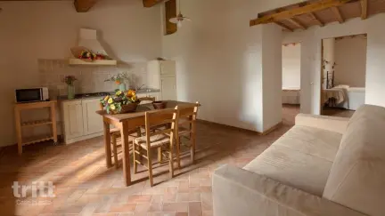 Het appartement ligt op de eerste verdieping en is ruim opgezet, perfect voor gezinnen. In de woonkamer bevindt zich een gezellige zithoek met slaapbank, een eethoek en een keukenblok met kookplaat, koelkast met vriesvak en een Italiaans koffiezetapparaat. De twee slaapkamers, één met een tweepersoonsbed en één met twee eenpersoonsbedden, bieden voldoende ruimte en privacy. Het appartement beschikt over twee badkamers met douche, wat ideaal is voor gezinnen of samen reizende stellen. Beneden, op de begane grond, bevindt zich een fijne veranda met tuinmeubilair en uitzicht op de groene tuin rondom het gebouw. Het terrein is volledig omheind, met veel ruimte om te spelen. Kinderen kunnen zich uitleven bij de speeltuin, de tafeltennistafel of in de tuin. Het verwarmde zwembad bij één van de landhuizen is geopend van Pasen tot en met oktober, waardoor je zelfs in de meivakantie en herfstvakantie kunt genieten van een aangename duik. In het hoogseizoen wordt er één avond per week een diner verzorgd met biologische streekgerechten uit eigen productie. Buiten het hoogseizoen kan dit op aanvraag voor groepen vanaf acht personen. Het ontbijt, met huisgemaakte zoetigheden en jams, is eveneens een aanrader. Op slechts 3 kilometer ligt Pomarance met een supermarkt, enkele restaurants en een bank.