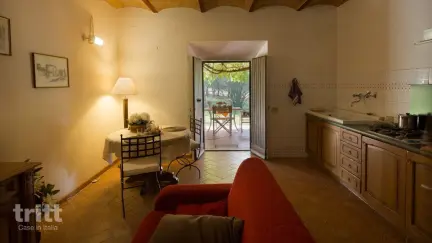 Op het uitgestrekte terrein staan twee traditionele landhuizen, elk met een eigen zwembad. Eén daarvan is een zoutwaterbad dat in voor- en naseizoen wordt verwarmd, ideaal voor gezinnen die graag in meivakantie of herfstvakantie reizen. Het appartement bevindt zich op de begane grond en biedt een gezellige woonkamer met keukenhoek, een slaapkamer met tweepersoonsbed, een kamer met 2 eenpersoonsbedden en een badkamer met douche. Buiten wacht een ruim terras met uitzicht op de tuin rondom het zwembad, een fijne plek voor ontbijt of een glas wijn in de avondzon. Op het landgoed worden biologische producten verbouwd en tijdens het seizoen worden er met veel liefde streekgerechten gekookt voor de gasten, compleet met huisgemaakte zoetigheden en jams.
