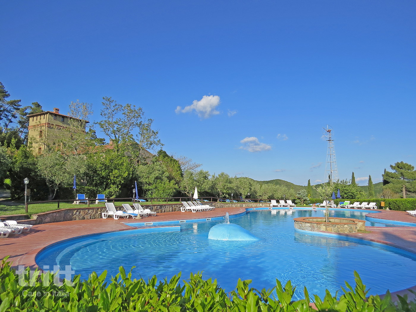 Centraal op het terrein ligt een groot zwembad van circa 300 m² met een ondiep gedeelte voor kinderen en hydromassage. Rondom staan ligstoelen en parasols, en er is volop ruimte om te relaxen of een boek te lezen in de schaduw van de bomen. De kinderen vermaken zich op het speelveld met voetbaldoelen, bij de tafeltennistafel of op de speeltoestellen, terwijl ouders genieten van een drankje of ijsje bij de bar. De ligging op de heuvel zorgt voor een lichte verkoeling in de avond en een prachtig uitzicht over het Toscaanse landschap. De appartementen zijn eenvoudig, maar praktisch ingericht en voorzien van airconditioning, zodat je ook op warme zomerdagen comfortabel verblijft.