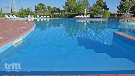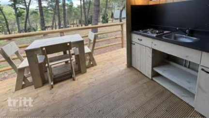 Buiten is er een overdekte veranda met keukenblok, tafel en stoelen, de perfecte plek om te ontbijten of te genieten van een glas wijn in de avondzon. Er zijn in totaal vijf van deze tenten; bij beperkte beschikbaarheid kan op aanvraag worden gecontroleerd of er nog plek is. Aankomst en vertrek zijn mogelijk op maandag en vrijdag in het hoogseizoen. Centraal op het terrein ligt een groot organisch gevormd zwembad (ca. 300 m², onverwarmd) met ondiep gedeelte voor kinderen en hydromassage. Hier kunnen gezinnen heerlijk ontspannen – badmuts is niet verplicht. Voor de kinderen is er volop ruimte om te spelen: een veldje met voetbaldoelen, tafeltennistafel en enkele speeltoestellen zorgen voor uren plezier. Bij de bar kun je terecht voor ijsjes of een lichte snack. De ligging op de heuvel zorgt voor een aangename bries en prachtige vergezichten over het Toscaanse landschap. De sfeer is ontspannen, ongedwongen en ideaal voor gezinnen die op zoek zijn naar een rustige vakantie midden in de natuur.