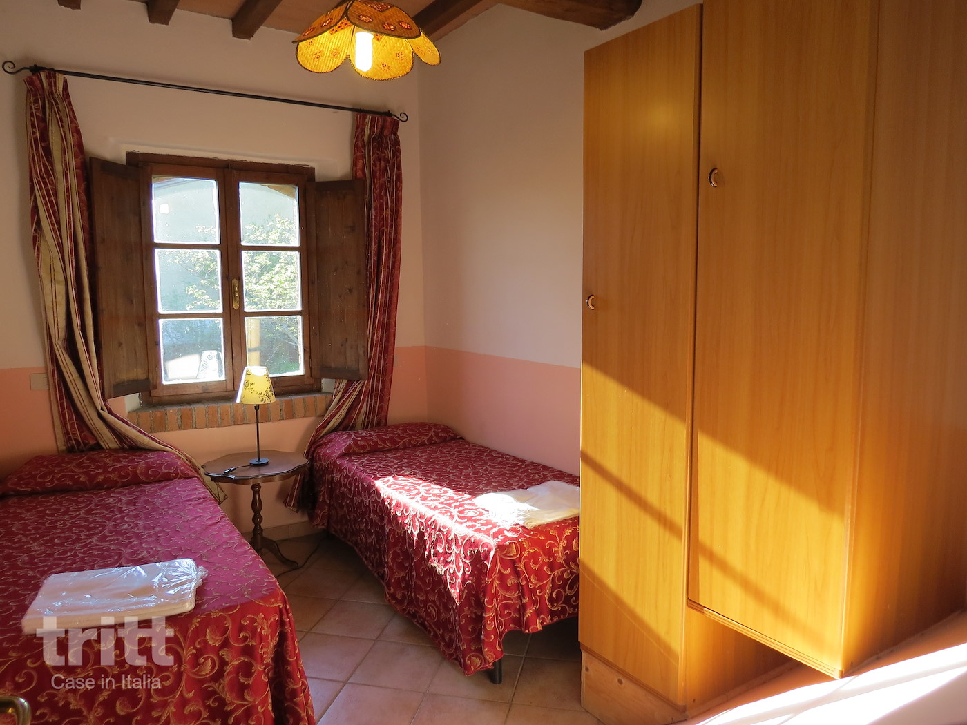 De verdieping beschikt over twee slaapkamers: één met een tweepersoonsbed en één met twee tot drie eenpersoonsbedden, plus een badkamer met bad. Buiten is er een overdekt terras met eettafel, stoelen en barbecue, met uitzicht op het zwembad en de omliggende heuvels. De inrichting is eenvoudig maar sfeervol, met veel natuurlijke materialen en warme kleuren die perfect passen bij de Toscaanse stijl.