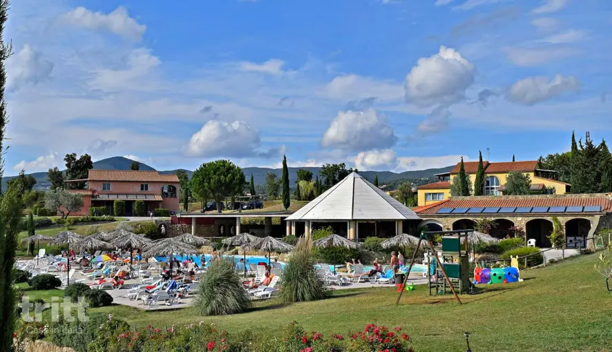 Deze charmante residence beschikt over 45 appartementen in landelijke Toscaanse stijl, variërend van knus tot ruim. De inrichting is eenvoudig maar sfeervol, met tegelvloeren, houten balken en warme kleuren die de authentieke sfeer van het Toscaanse platteland behouden. In de tuin liggen twee zwembaden met zoutwater, waarvan één met ondiep gedeelte voor kinderen. Rondom de baden vind je een groot zonneterras met ligstoelen, parasols en een adembenemend uitzicht richting zee. ’s Avonds zorgt de sfeervolle verlichting voor een bijna magische ambiance. Het 4-persoons appartement (2+2 pers.) bevindt zich op de begane grond of eerste verdieping van een van de landhuizen (A t/m E). Het bestaat uit een woonruimte met eethoek, slaapbank en keukenblok, een slaapkamer met tweepersoonsbed en een moderne badkamer met douche, toilet en bidet. Sommige appartementen beschikken over een extra bed of slaapbank. Buiten is er een overdekt terras of balkon waar je heerlijk kunt ontbijten of een glas wijn drinkt bij zonsondergang. Bij het zwembad ligt een gezellig restaurant met terras en bar, waar je terecht kunt voor koffie, drankjes en eenvoudige Toscaanse gerechten. Op aanvraag is ook ontbijt mogelijk. Voor kinderen is er volop speelruimte met een tafeltennistafel, een klein speeltuintje en een vijver met vissen en kikkers, altijd een succes bij de jongste gasten.
