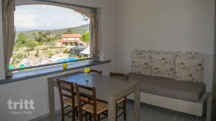 Deze charmante residence beschikt over 45 appartementen in landelijke Toscaanse stijl, variërend van knus tot ruim. De inrichting is eenvoudig maar sfeervol, met tegelvloeren, houten balken en warme kleuren die de authentieke sfeer van het Toscaanse platteland behouden. In de tuin liggen twee zwembaden met zoutwater, waarvan één met ondiep gedeelte voor kinderen. Rondom de baden vind je een groot zonneterras met ligstoelen, parasols en een adembenemend uitzicht richting zee. ’s Avonds zorgt de sfeervolle verlichting voor een bijna magische ambiance. Het 4-persoons appartement (2+2 pers.) bevindt zich op de begane grond of eerste verdieping van een van de landhuizen (A t/m E). Het bestaat uit een woonruimte met eethoek, slaapbank en keukenblok, een slaapkamer met tweepersoonsbed en een moderne badkamer met douche, toilet en bidet. Sommige appartementen beschikken over een extra bed of slaapbank. Buiten is er een overdekt terras of balkon waar je heerlijk kunt ontbijten of een glas wijn drinkt bij zonsondergang. Bij het zwembad ligt een gezellig restaurant met terras en bar, waar je terecht kunt voor koffie, drankjes en eenvoudige Toscaanse gerechten. Op aanvraag is ook ontbijt mogelijk. Voor kinderen is er volop speelruimte met een tafeltennistafel, een klein speeltuintje en een vijver met vissen en kikkers, altijd een succes bij de jongste gasten.