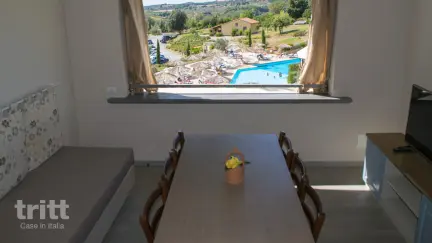De residence Vista Mare bestaat uit 45 appartementen, ingericht in warme, landelijke stijl met terracotta vloeren en houten balkenplafonds. Dit 6-persoons appartement ligt op de begane grond of eerste verdieping en beschikt over een overdekt terras of balkon met uitzicht over het Toscaanse landschap. Binnen vind je een lichte woonkamer met eethoek, keukenblok en tweepersoonsslaapbank, een slaapkamer met tweepersoonsbed, een tweede slaapkamer met twee eenpersoonsbedden, een badkamer met douche, toilet en bideten een extra aparte toiletruimte. Ideaal voor gezinnen of stellen die samen reizen. Het complex heeft twee zwembaden (onverwarmd), waarvan één met kinderbad, omringd door een zonneterras met ligstoelen en parasols. Bij het zwembad ligt een gezellig restaurant en bar waar je terecht kunt voor koffie, drankjes of eenvoudige Toscaanse gerechten. ’s Avonds is het zwembad sfeervol verlicht, perfect voor een ontspannen duik met uitzicht op de ondergaande zon. Voor kinderen is er volop vermaak met een tafeltennistafel, speeltoestellen en een klein vijvertje met vissen en kikkersbij de receptie.