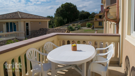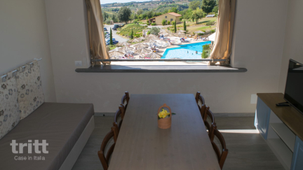 De residence Vista Mare bestaat uit 45 appartementen, ingericht in warme, landelijke stijl met terracotta vloeren en houten balkenplafonds. Dit 6-persoons appartement ligt op de begane grond of eerste verdieping en beschikt over een overdekt terras of balkon met uitzicht over het Toscaanse landschap. Binnen vind je een lichte woonkamer met eethoek, keukenblok en tweepersoonsslaapbank, een slaapkamer met tweepersoonsbed, een tweede slaapkamer met twee eenpersoonsbedden, een badkamer met douche, toilet en bideten een extra aparte toiletruimte. Ideaal voor gezinnen of stellen die samen reizen. Het complex heeft twee zwembaden (onverwarmd), waarvan één met kinderbad, omringd door een zonneterras met ligstoelen en parasols. Bij het zwembad ligt een gezellig restaurant en bar waar je terecht kunt voor koffie, drankjes of eenvoudige Toscaanse gerechten. ’s Avonds is het zwembad sfeervol verlicht, perfect voor een ontspannen duik met uitzicht op de ondergaande zon. Voor kinderen is er volop vermaak met een tafeltennistafel, speeltoestellen en een klein vijvertje met vissen en kikkersbij de receptie.