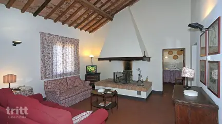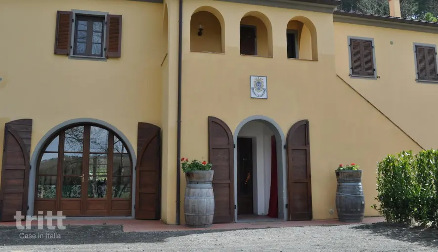 Een sfeervol landhuis op een uitgestrekt wijnlandgoed tussen Pisa en Volterra, omringd door groene heuvels en wijngaarden. Hier geniet je van lange uitzichten, rust en het authentieke Toscaanse landschap. Het oude klooster met zijn markante klokkentoren ligt op loopafstand en geeft de locatie een bijna tijdloze charme.