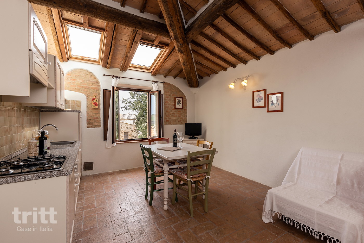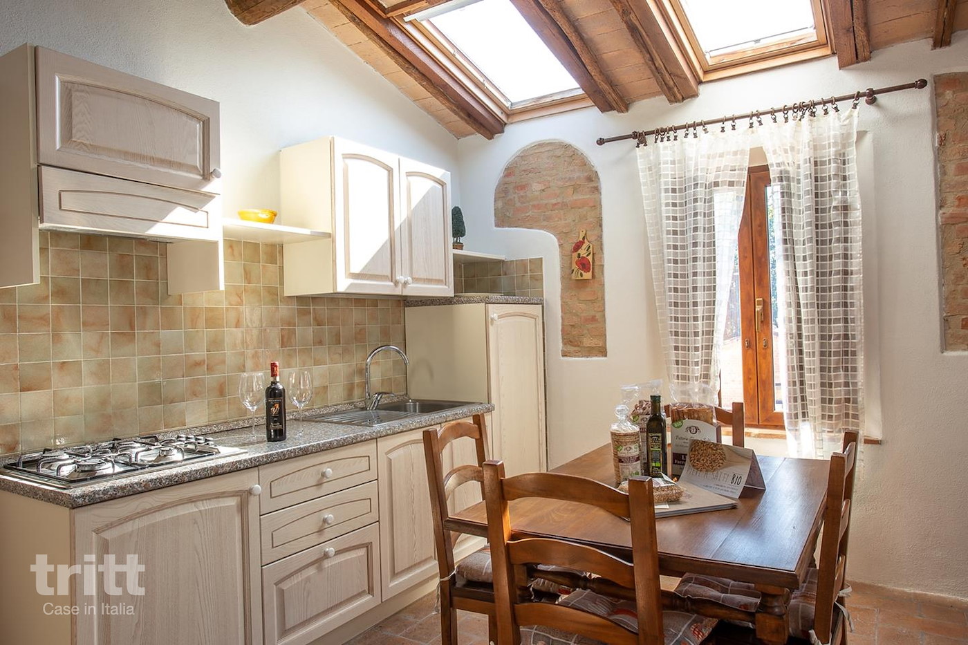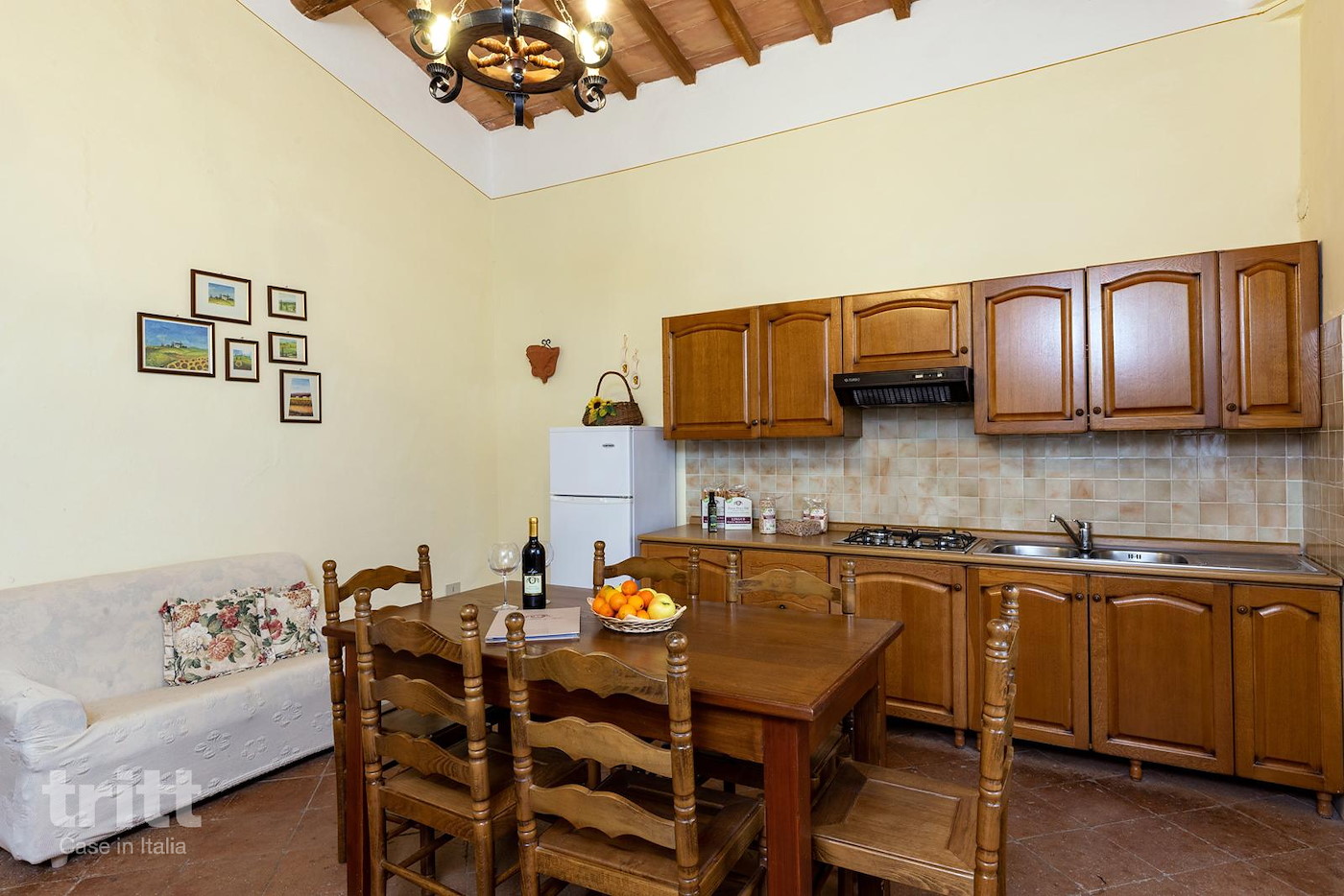De agriturismo bestaat uit 2 delen op korte afstand van elkaar. Bij het ene deel liggen het restaurant, het grote buitenzwembad met ligbedden en verschillende sportfaciliteiten. In het andere deel, waar ook de appartementen liggen, vind je het verwarmde binnenzwembad, een jacuzzi, sauna, stoombad, beautycentrum, manege, fietsverhuur en een kleine speeltuin. Het landgoed wordt biologisch beheerd, met eigen granen, olijfolie en peulvruchten. Gasten kunnen deelnemen aan rondleidingen, proeverijen, kookworkshops, paardrijlessen en fietstochten door het Toscaanse landschap. Het appartement beschikt over een woonkamer met zitje, kitchenette met 4-pits kookplaat en koelkast, een slaapkamer met tweepersoonsbed en een badkamer met douche. Op verzoek kan een extra bed worden bijgeplaatst. Er is geen privéterras, maar buiten zijn meerdere zitjes beschikbaar in de tuin.