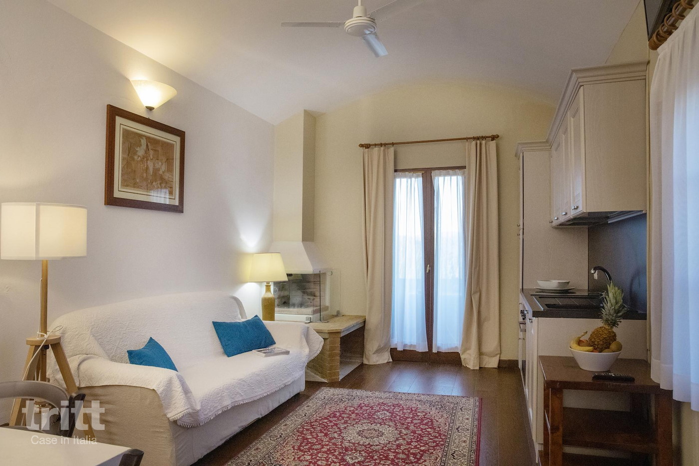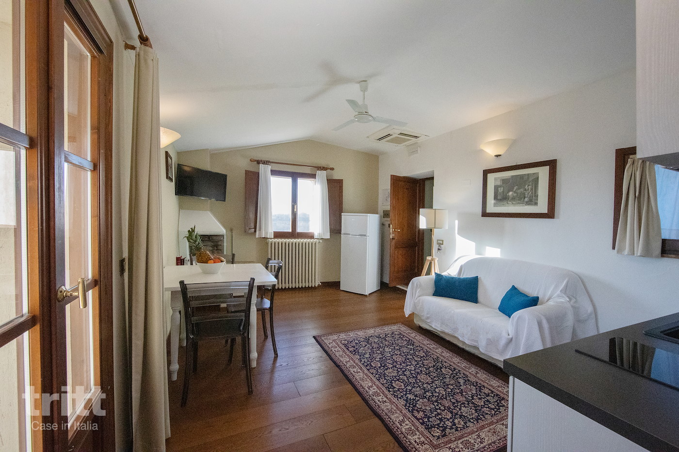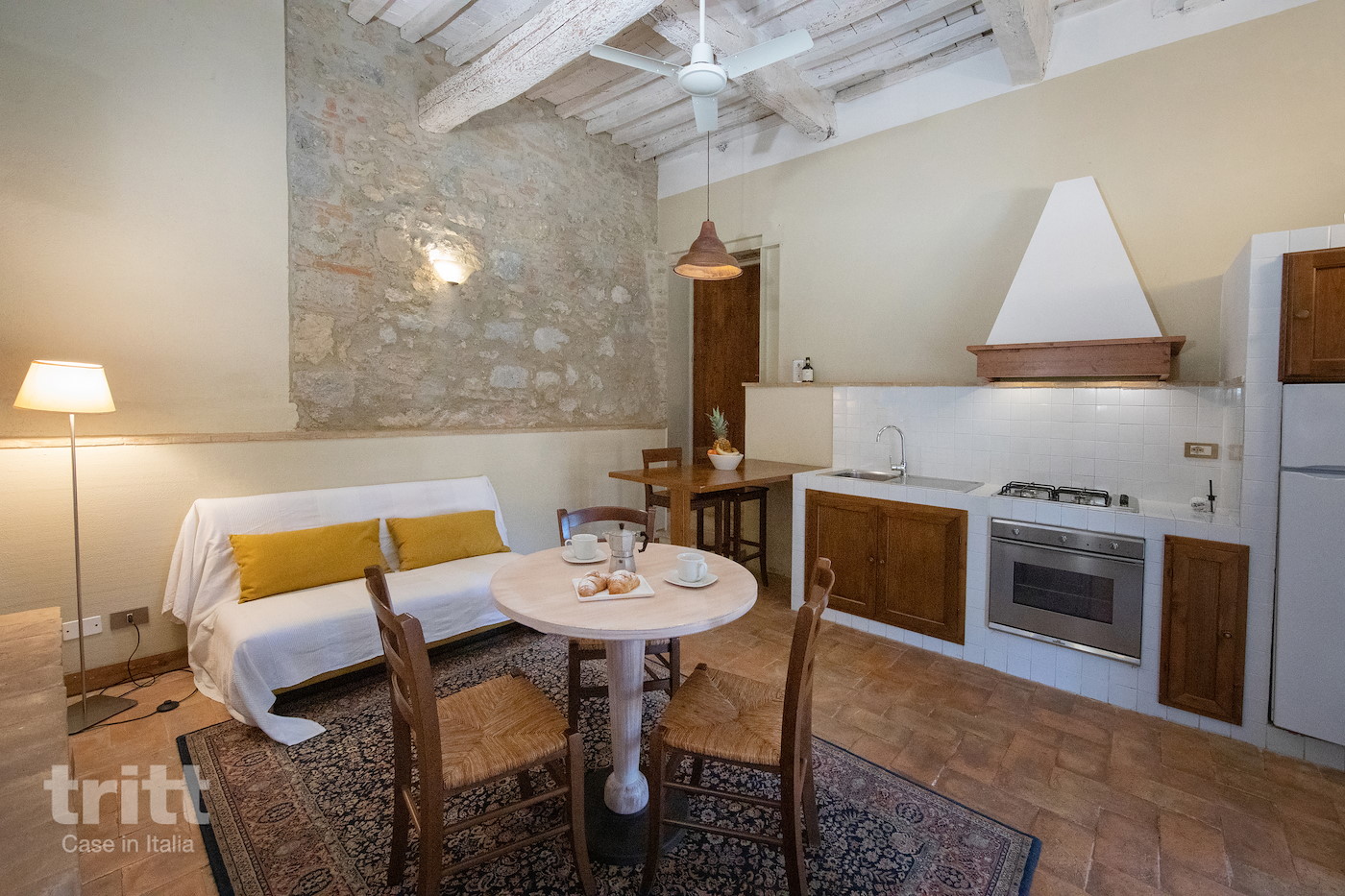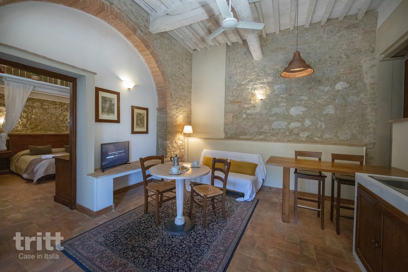 Het appartement is geschikt voor 4 personen en bevindt zich op de begane grond of op de 1e of 2e verdieping, waarbij de indeling per appartement kan variëren. Je beschikt over een woonkamer met zithoek en een eenpersoonsslaapbank of twijfelaar, TV, een eettafel en een keuken met oven, 4-pits kookplaat, koelkast met vriesvak, toaster en waterkoker. De slaapkamer is ingericht met een tweepersoonsbed en de badkamer heeft een douche. De appartementen op de begane grond beschikken over een privé terrasje met pergola, tafel en stoelen, terwijl de appartementen op de verdieping een balkon hebben. Airconditioning is aanwezig voor extra comfort. Ook zijn bed- en badlinnen inbegrepen, deze worden wekelijks verwisseld. Op het terrein ligt een zwembad (geopend van 08:30 tot 19:00 uur, badmuts verplicht) met zonneterras en ligstoelen, waar je geniet van een weids uitzicht over het Toscaanse landschap. Daarnaast zijn er een beachvolleybalveld, een wandelpad door de olijfbomen en een karakteristieke kapel. Op het naastgelegen landgoed kun je gebruikmaken van extra faciliteiten zoals een restaurant en een padelbaan.